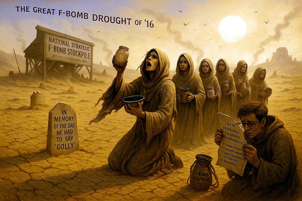 Who can forget the great f-bomb drought of 2016-2020? F-bombs were used so frequently that stockpiles were depleted, and we were reduced to using “gosh golly”, “sweet marmalade of despair”, and “heavens to Betsy.”
