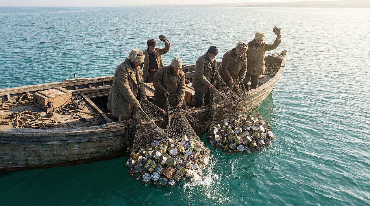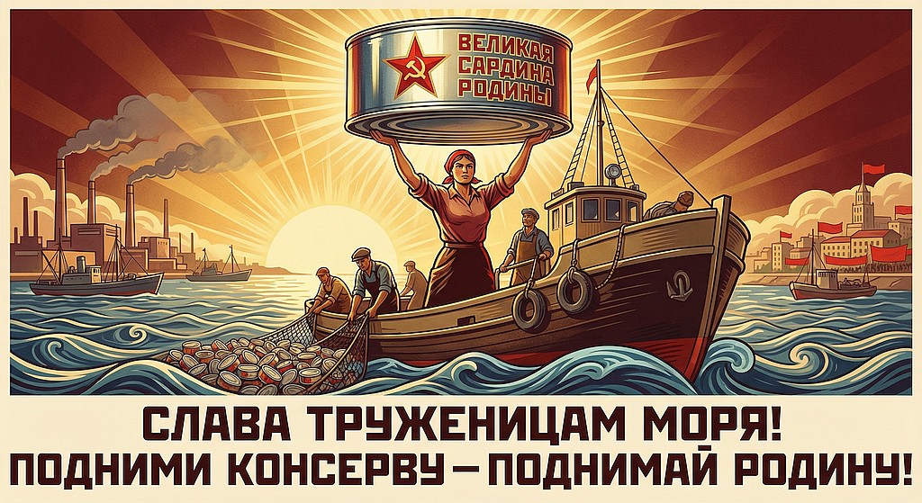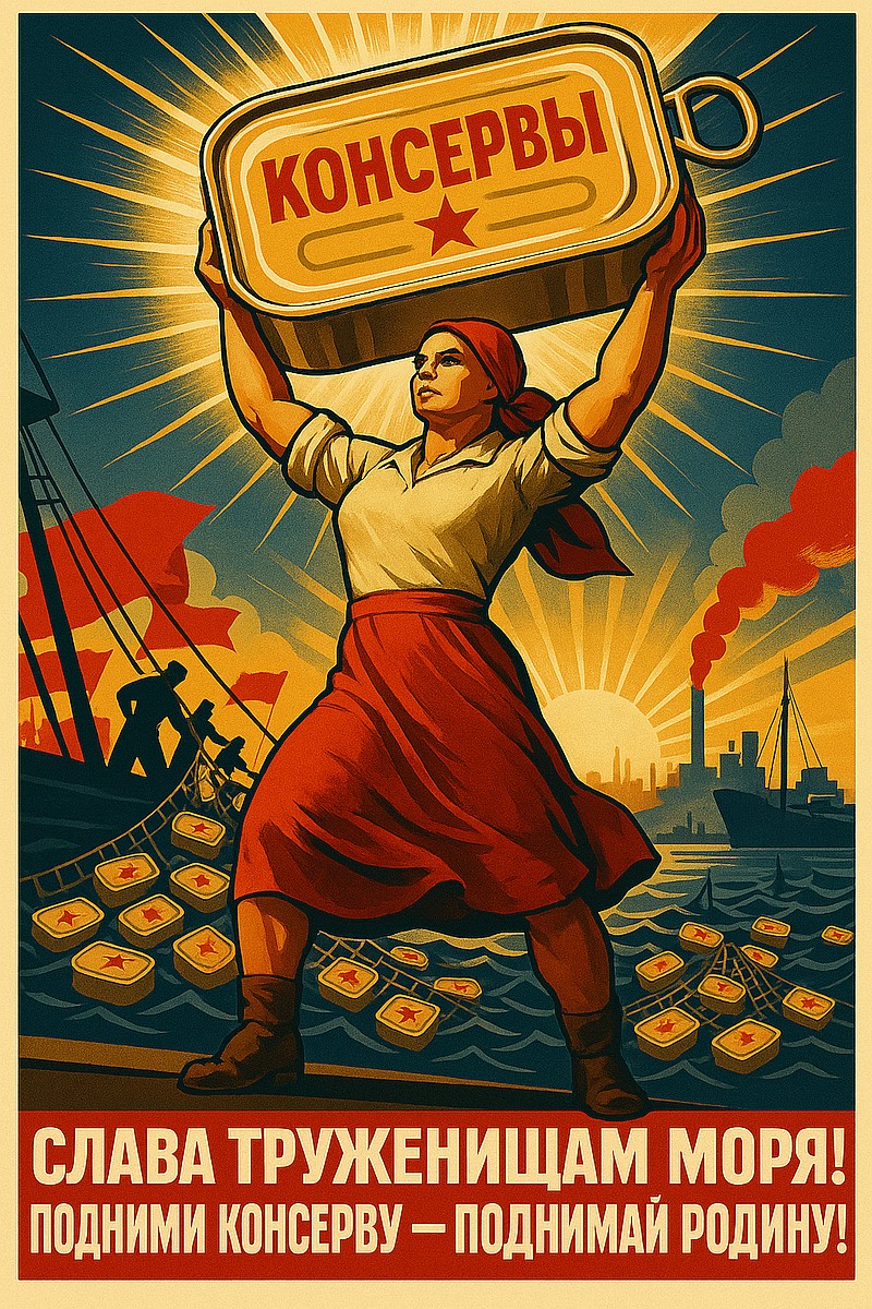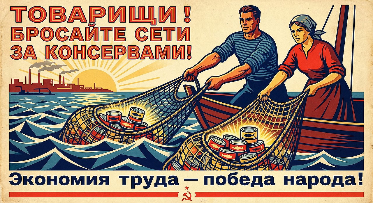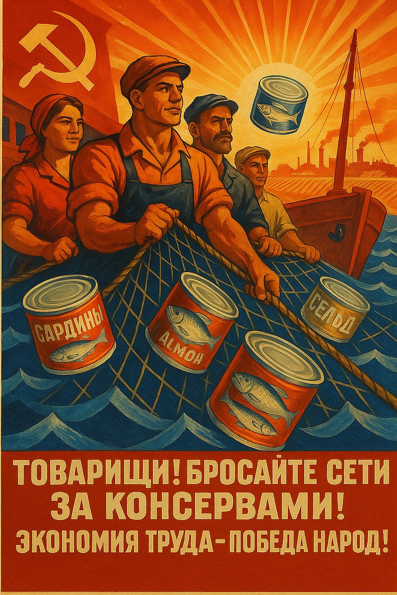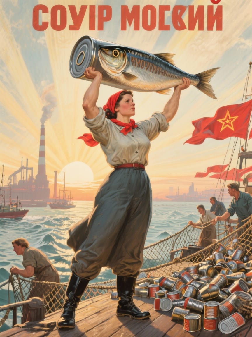 However, lower-level bureaucrats misunderstood the directive, and thought the party leaders expected to pull canned fish from the sea, directly into their nets. Impossible, of course, but you don’t tell the politburo that. So these mid-level toadies created a series of photos and art work to convince Moscow that they were following orders.