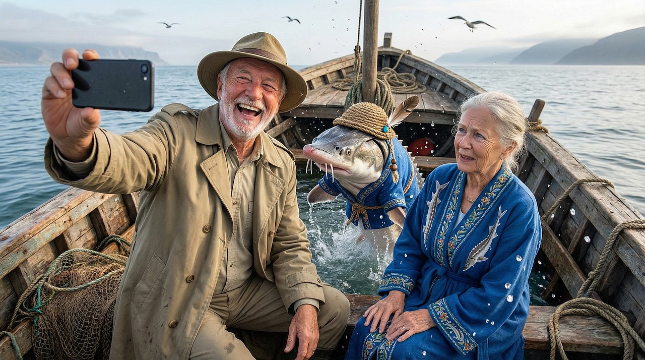Greetings from the Caspian Sea! Elder JZ (left), photo-bombing sturgeon, Elder G (right)