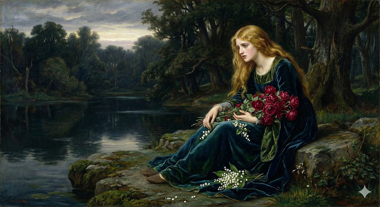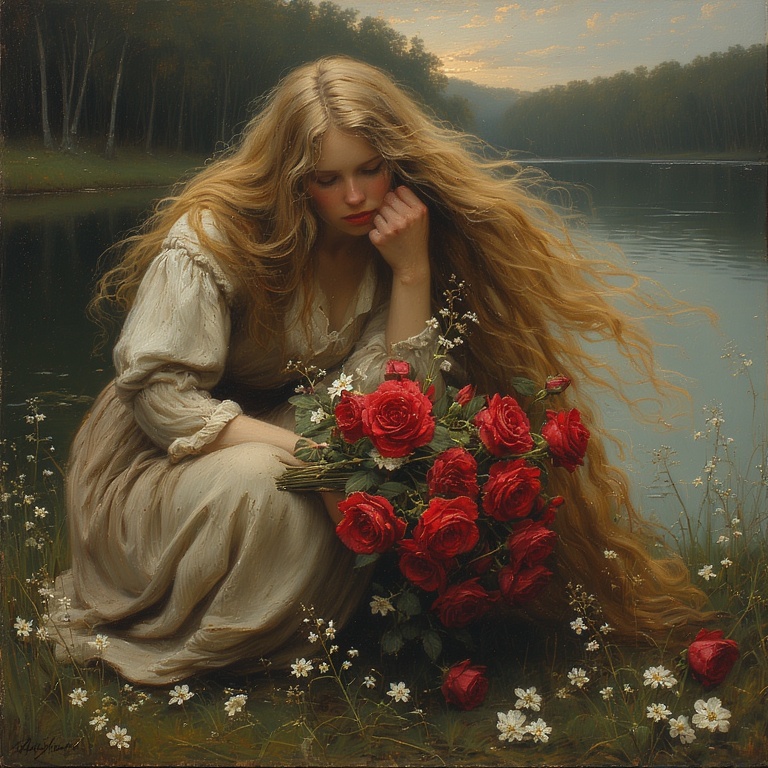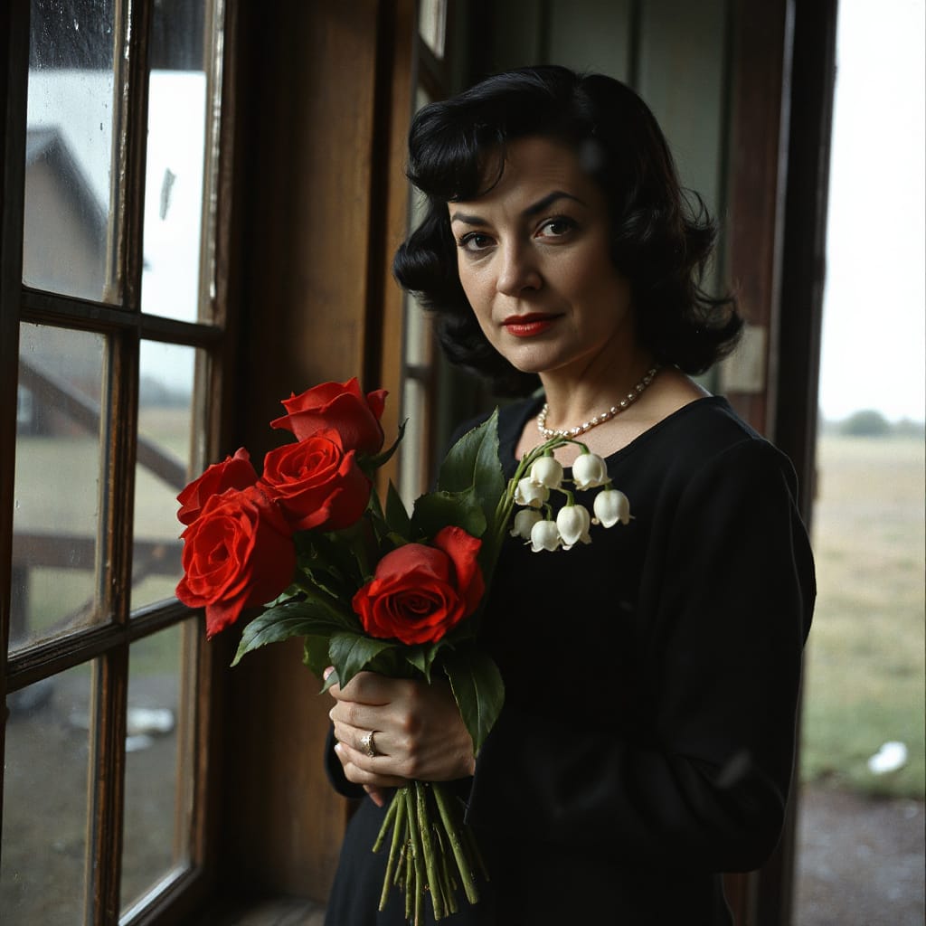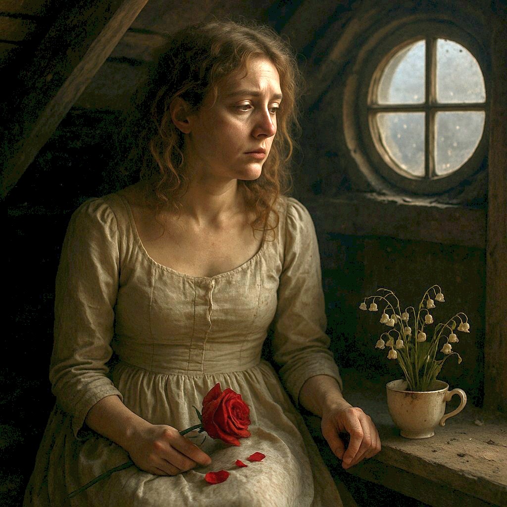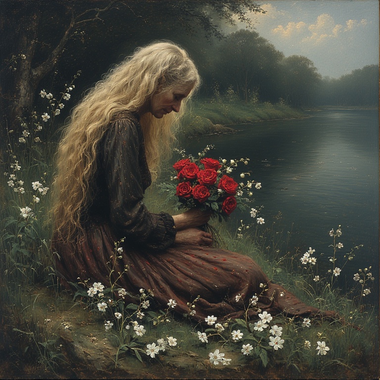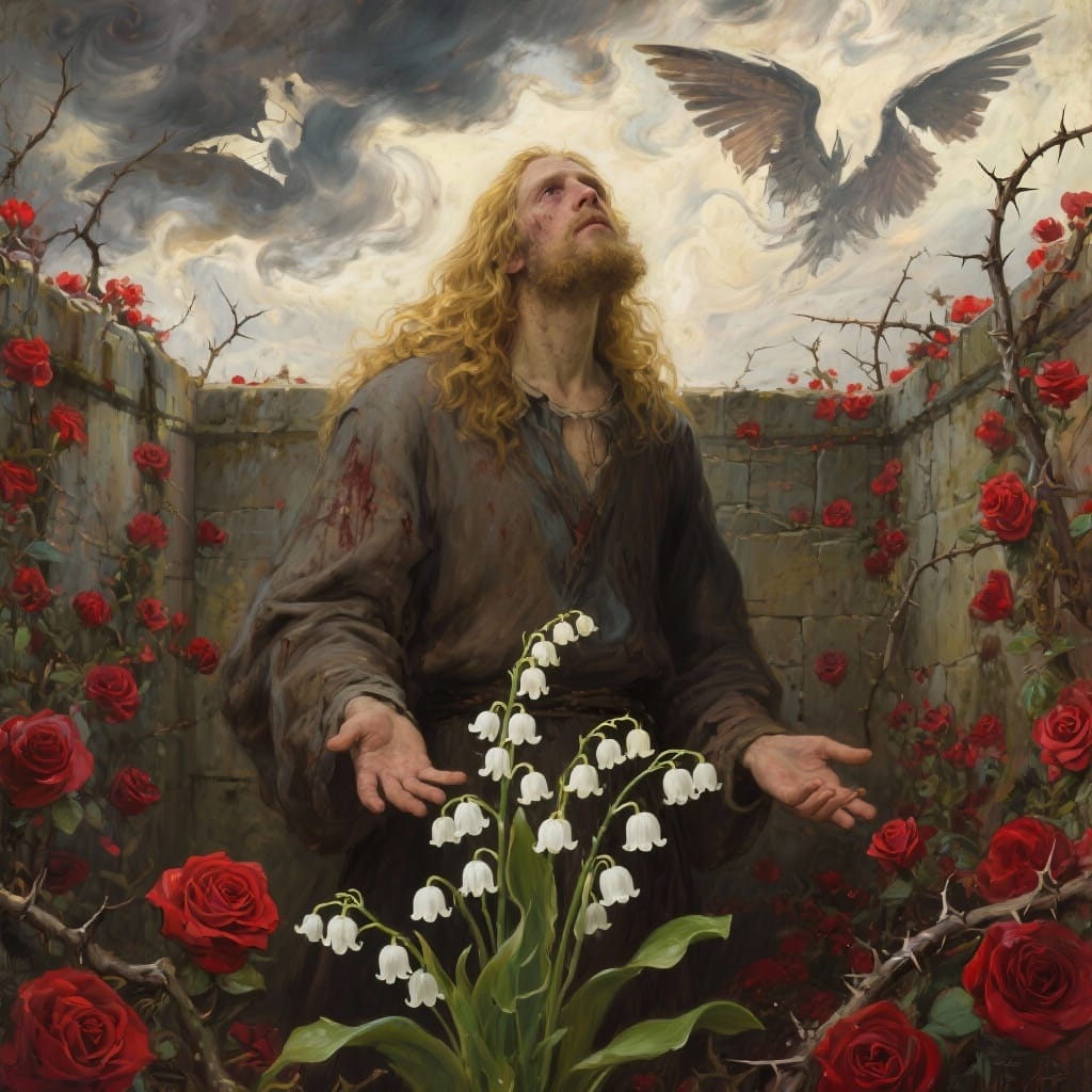 She just understood the weight of human finitude. She holds a bouquet of red roses—lush, blood-rich, symbolic of passion and suffering—and at her feet lie scattered lilies of the valley, tiny white bells representing innocence she fears she has already lost.