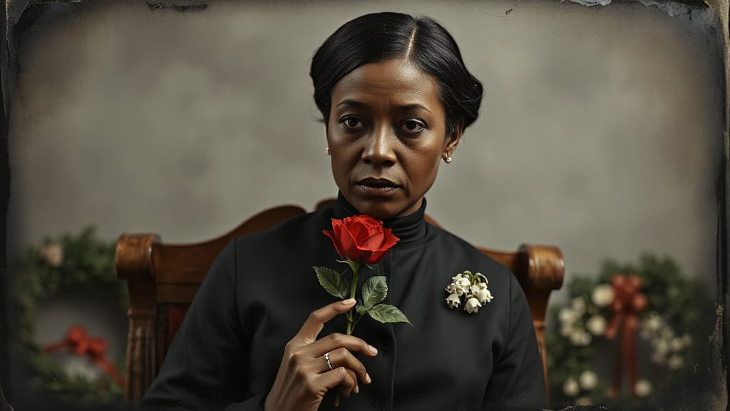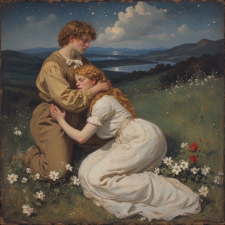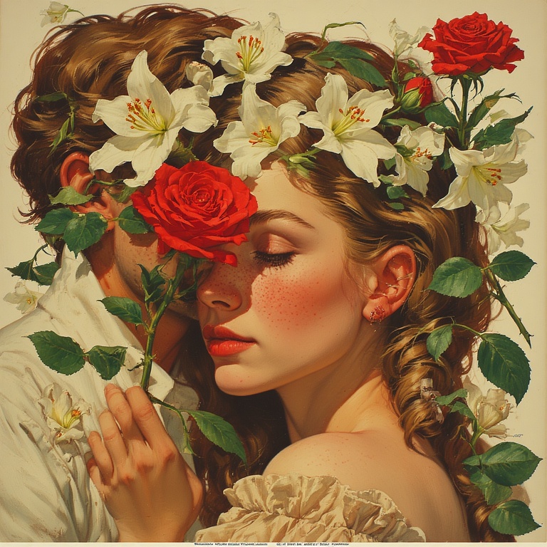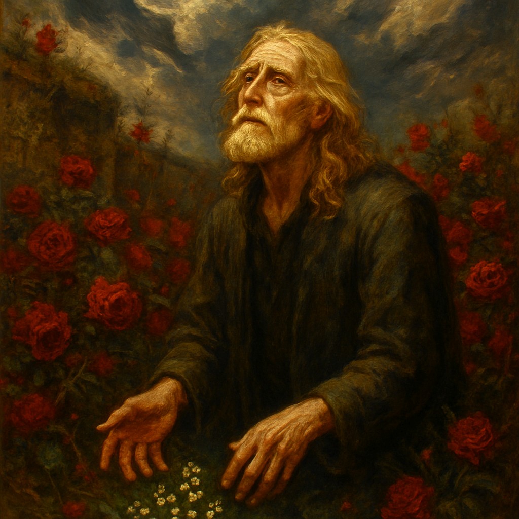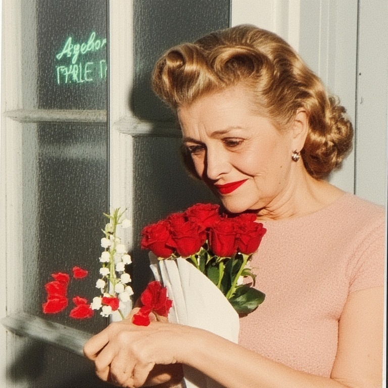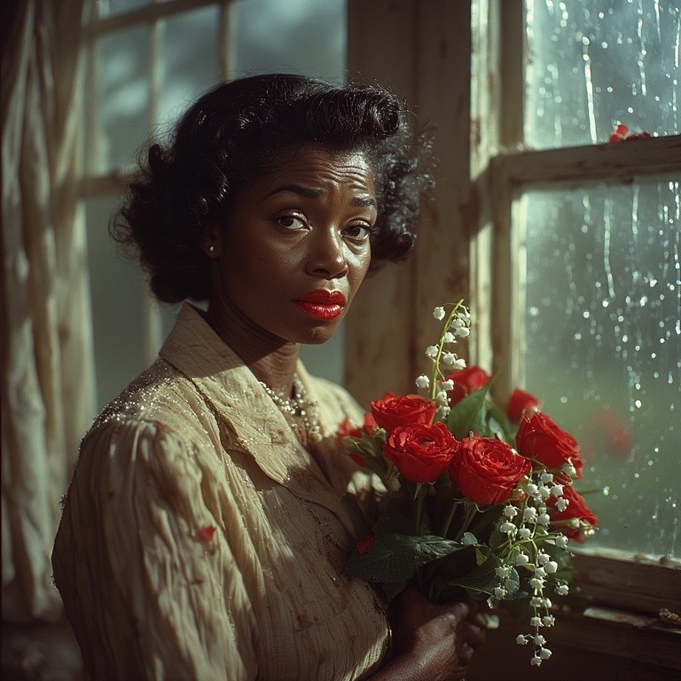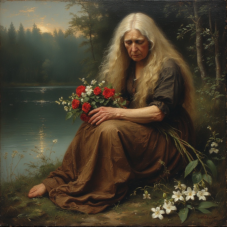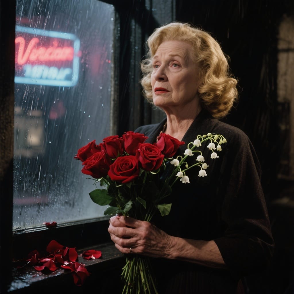 She just understood the weight of human finitude. She holds a bouquet of red roses—lush, blood-rich, symbolic of passion and suffering—and at her feet lie scattered lilies of the valley, tiny white bells representing innocence she fears she has already lost.