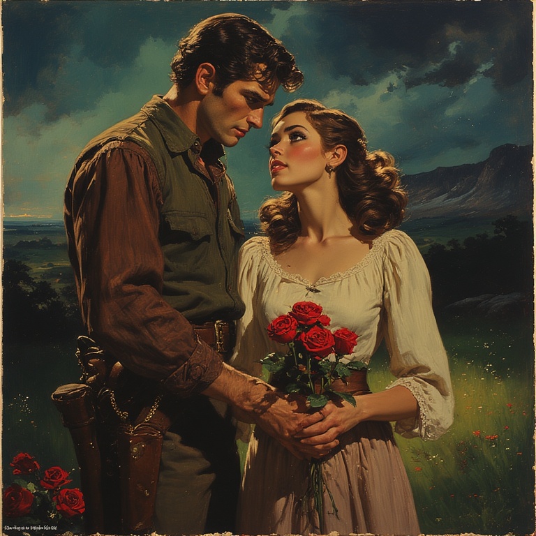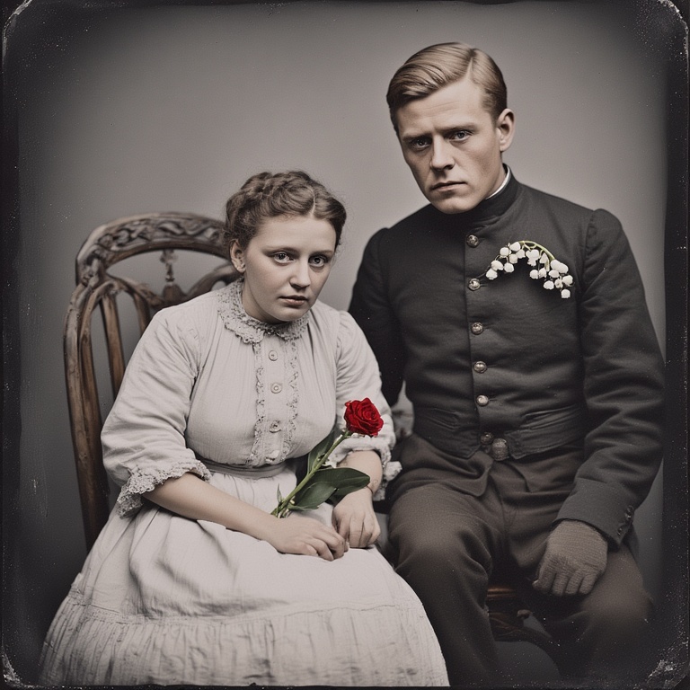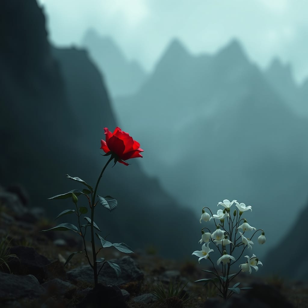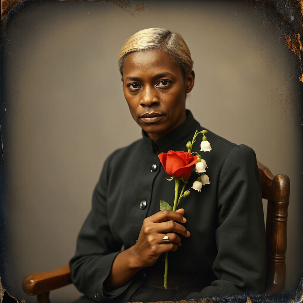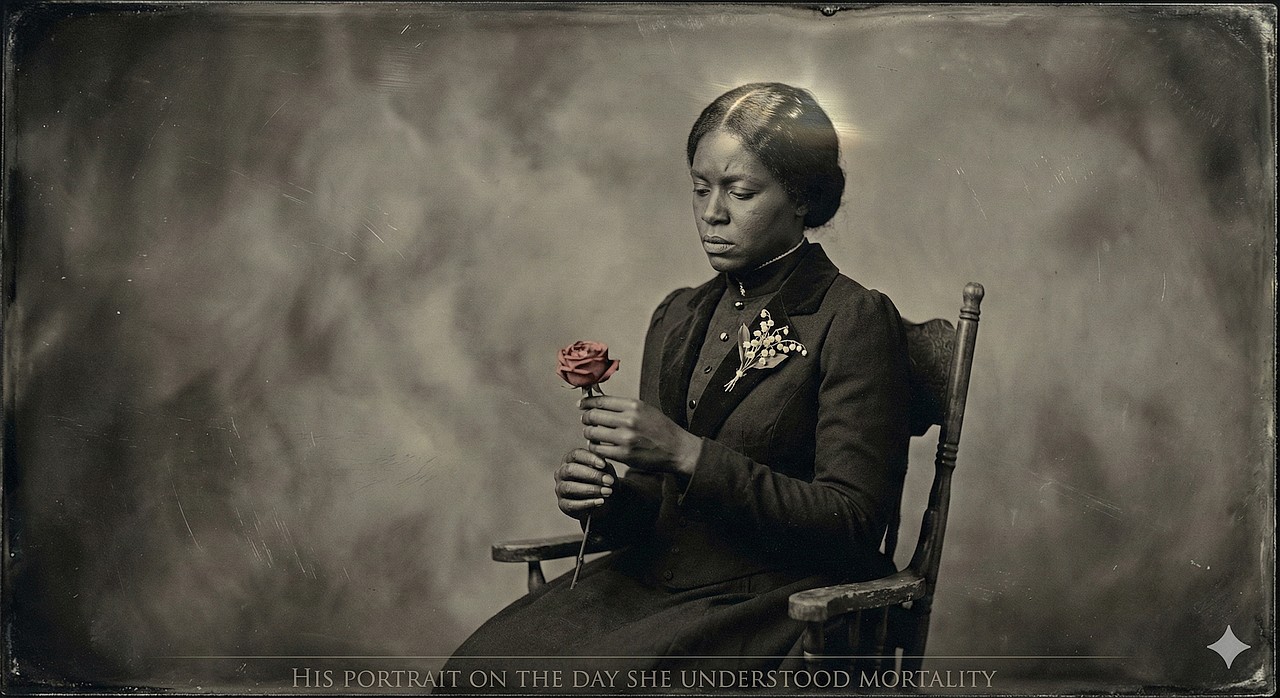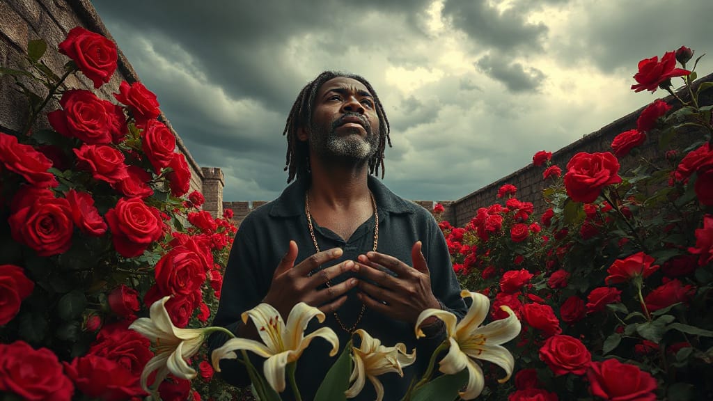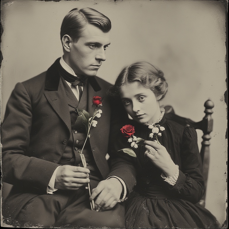 She just understood the weight of human finitude. She holds a bouquet of red roses—lush, blood-rich, symbolic of passion and suffering—and at her feet lie scattered lilies of the valley, tiny white bells representing innocence she fears she has already lost.