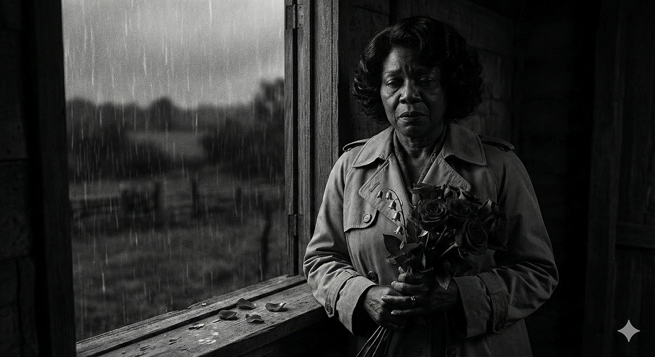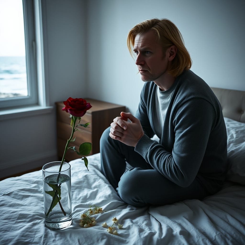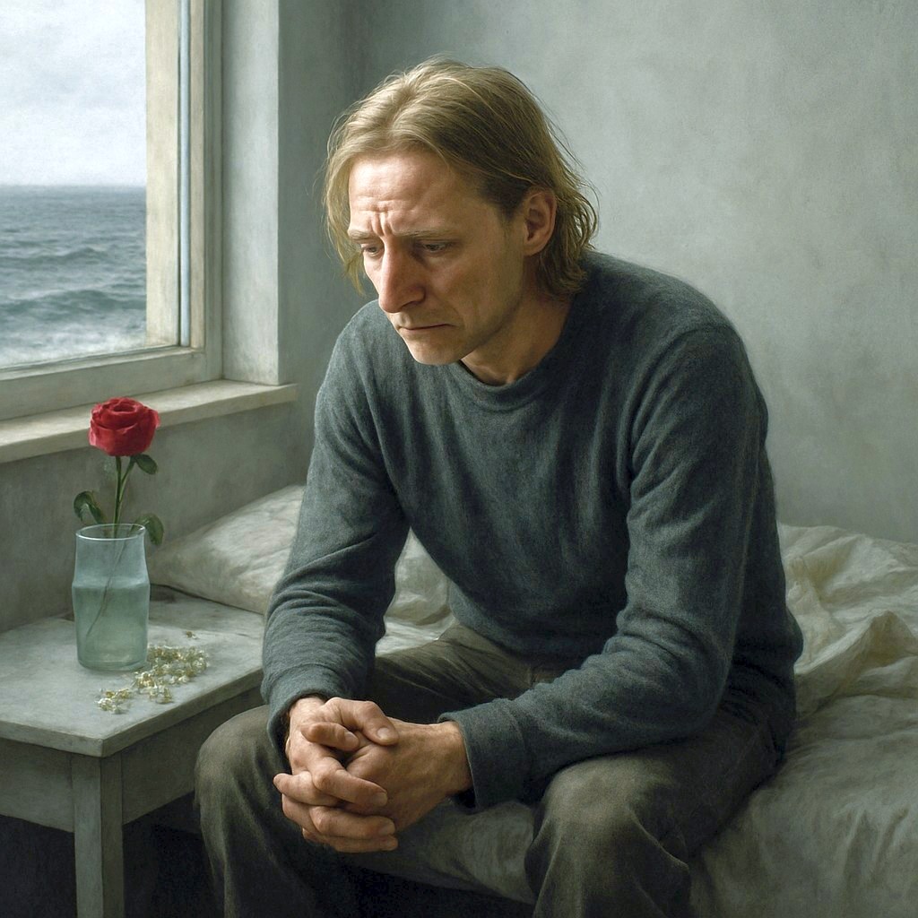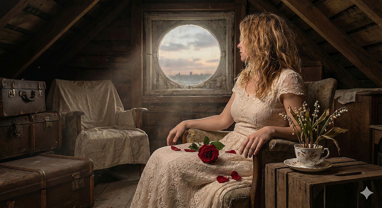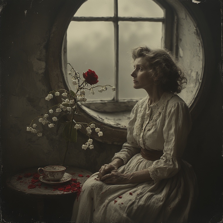 A woman sits beside a small round window, staring at the dim horizon with the heavy, vacant look of someone contemplating the absurdity of existence. A single red rose lies across her lap; its petals have started to fall, like tiny drops of blood on her pale dress.