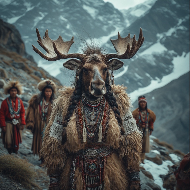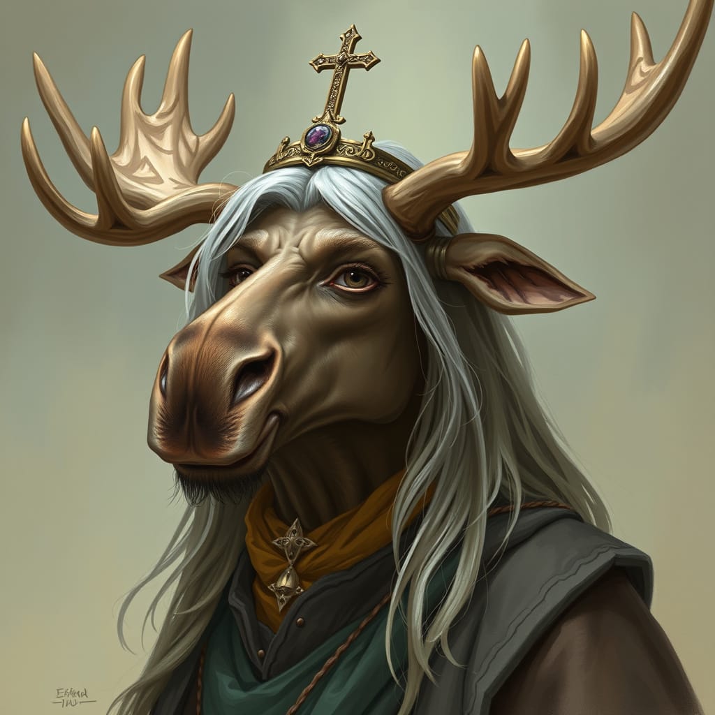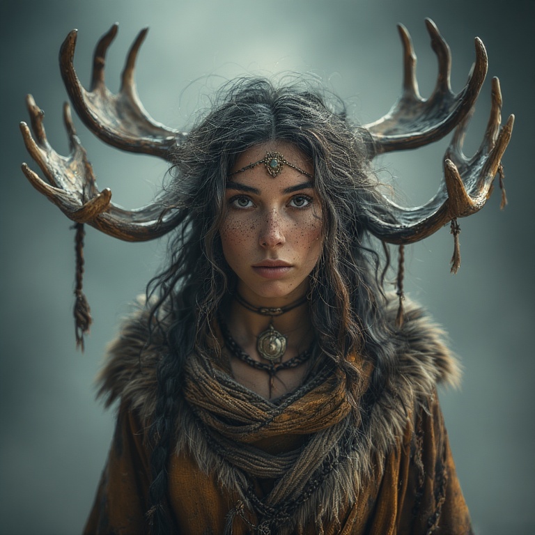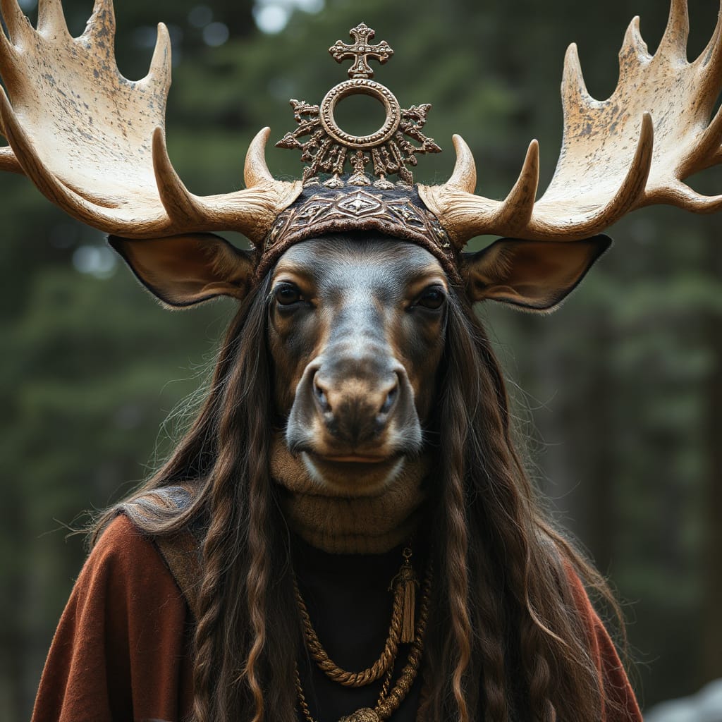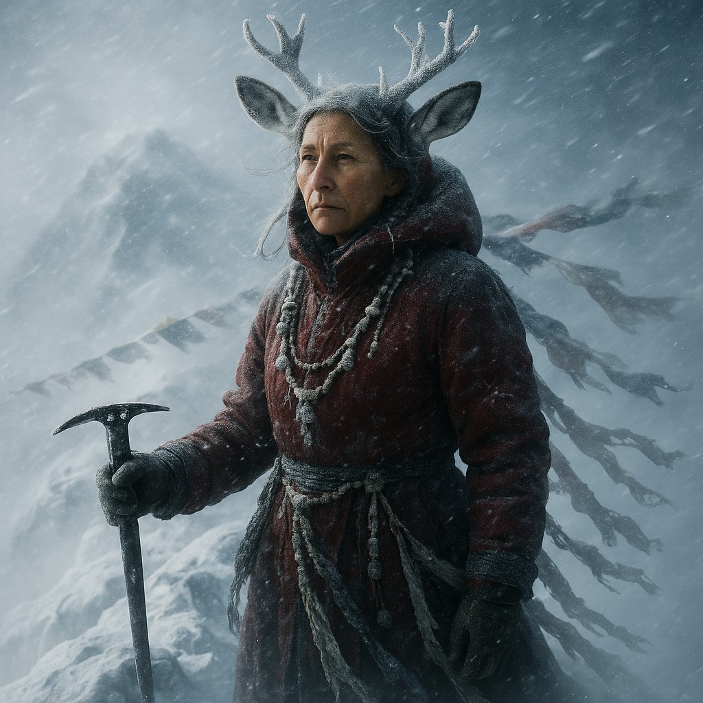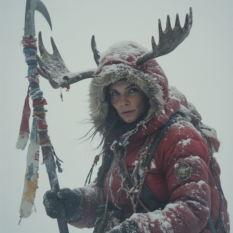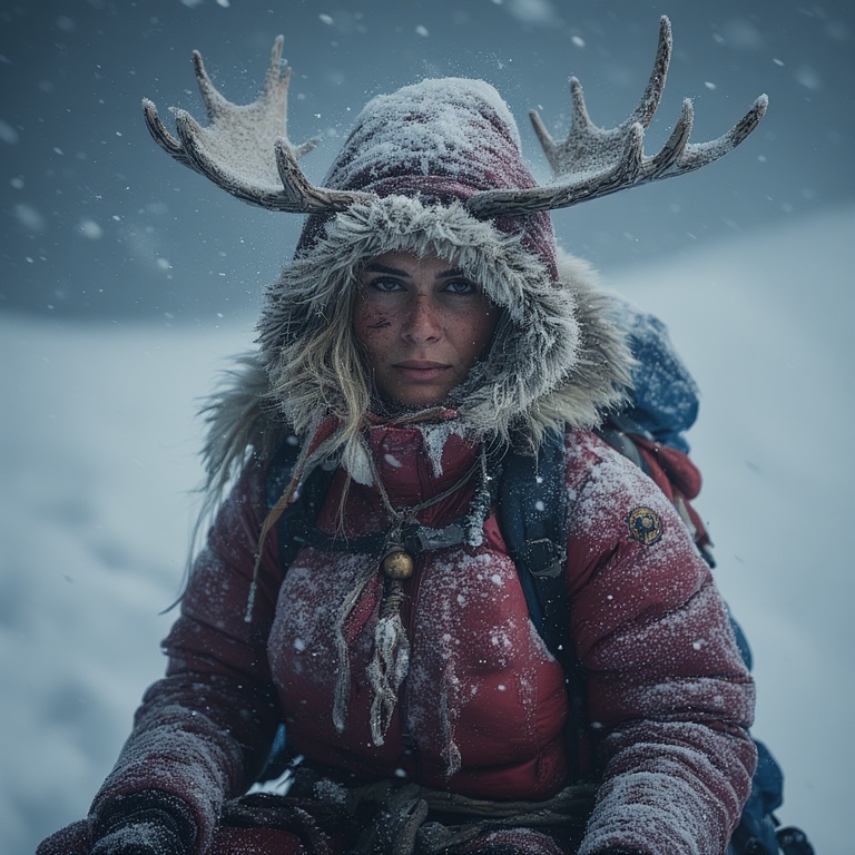 Our priestess: strong, calm despite the lethal environment. Her moose-ness is subtle, mythic, and harmonious with the extreme landscape. A small branching antler coronet rising from her hood, each tine coated in rime ice, glistening like crystalline horns.