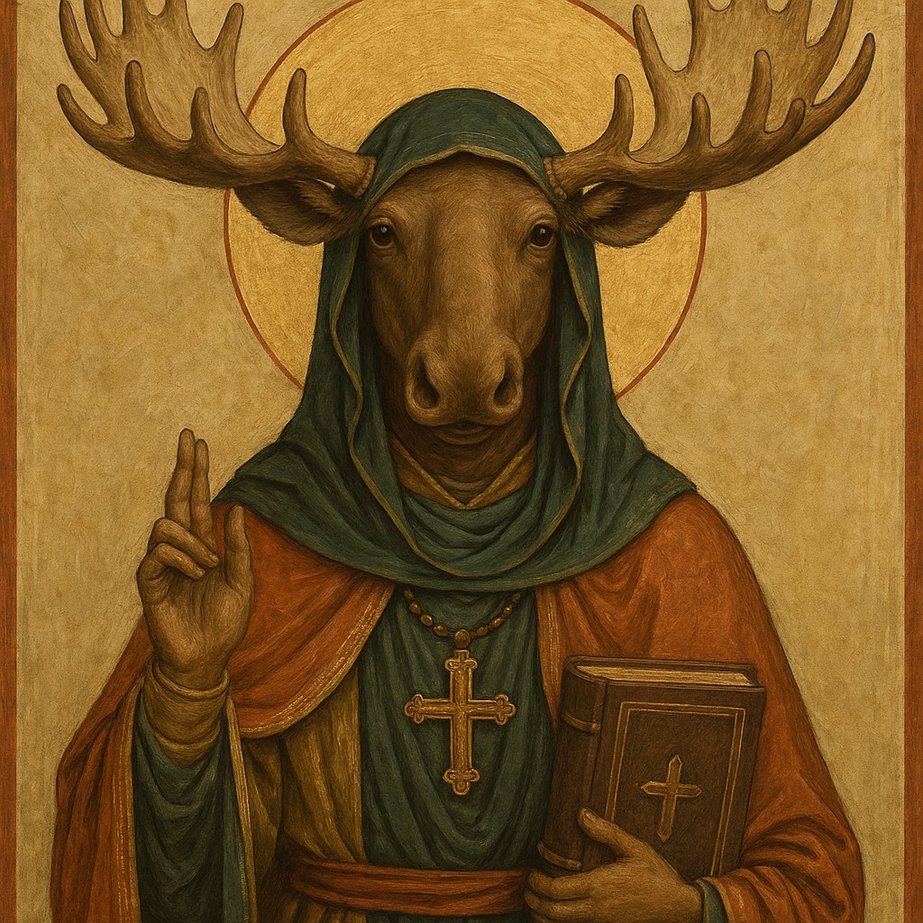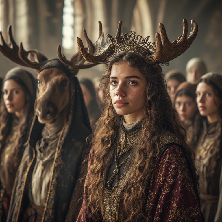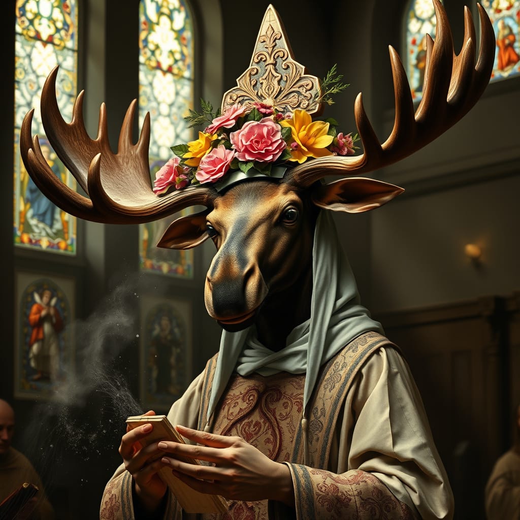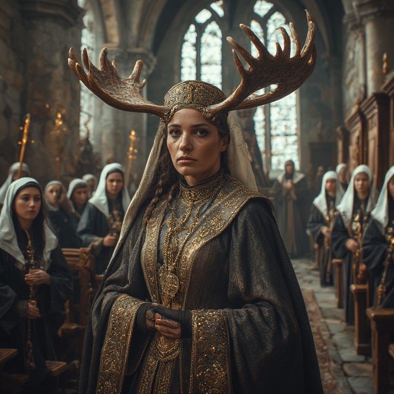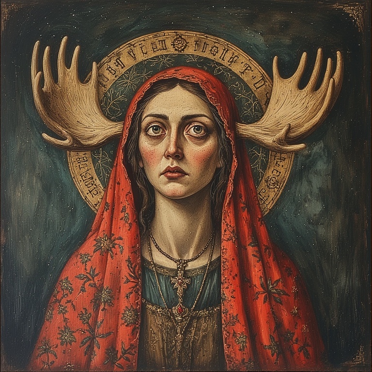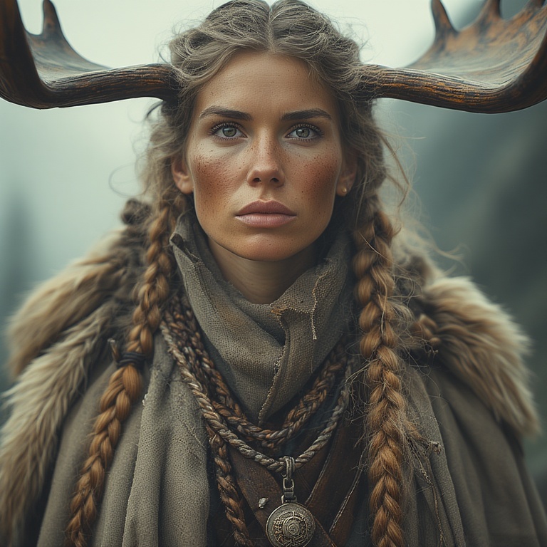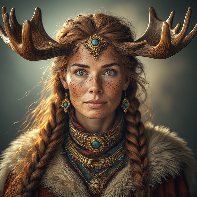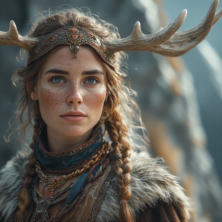 Our priestess: strong, calm despite the lethal environment. Her moose-ness is subtle, mythic, and harmonious with the extreme landscape. A small branching antler coronet rising from her hood, each tine coated in rime ice, glistening like crystalline horns.