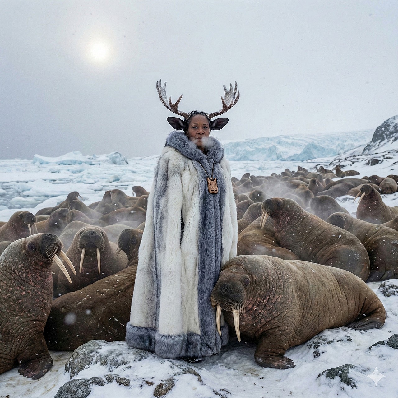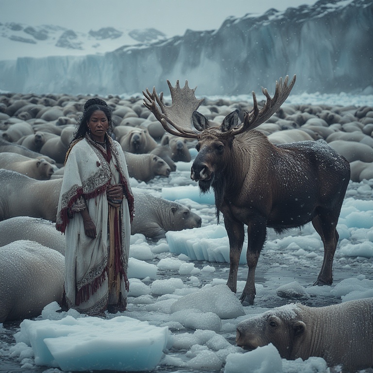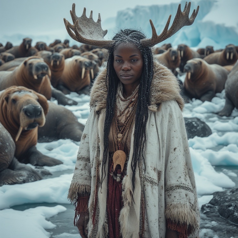 As the jagged sea ice extends into the gray Arctic Ocean, our brave mythic priestess stands peacefully amidst one of Earth’s great animal gatherings.