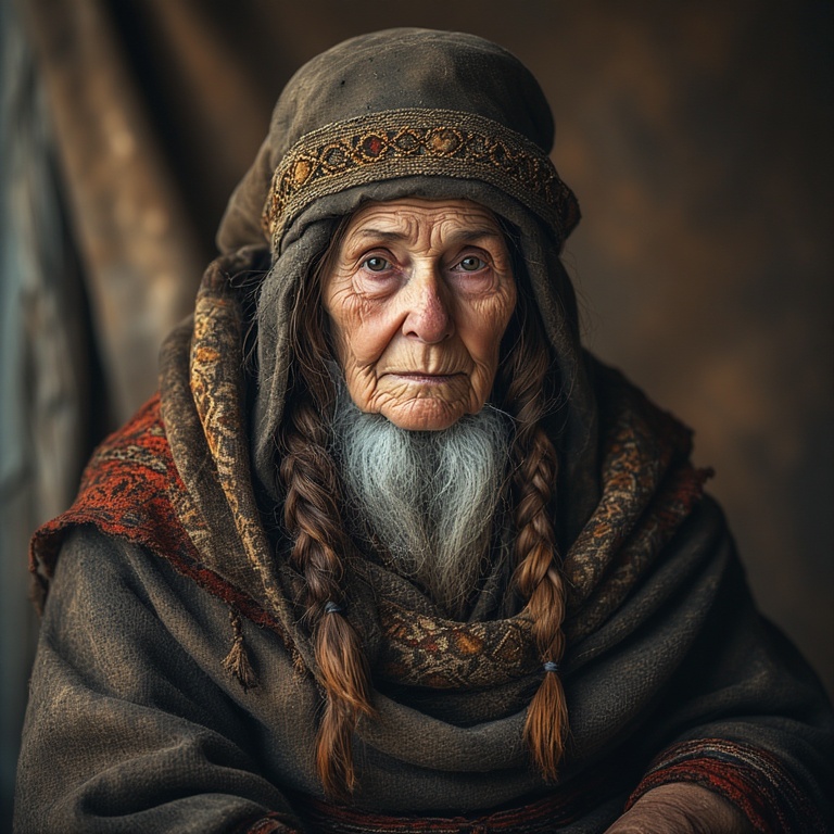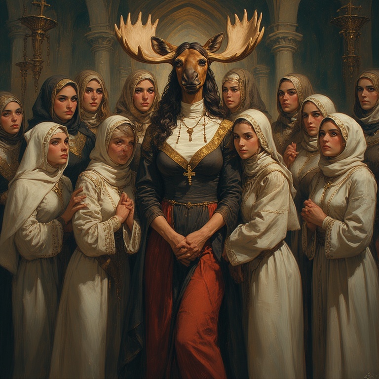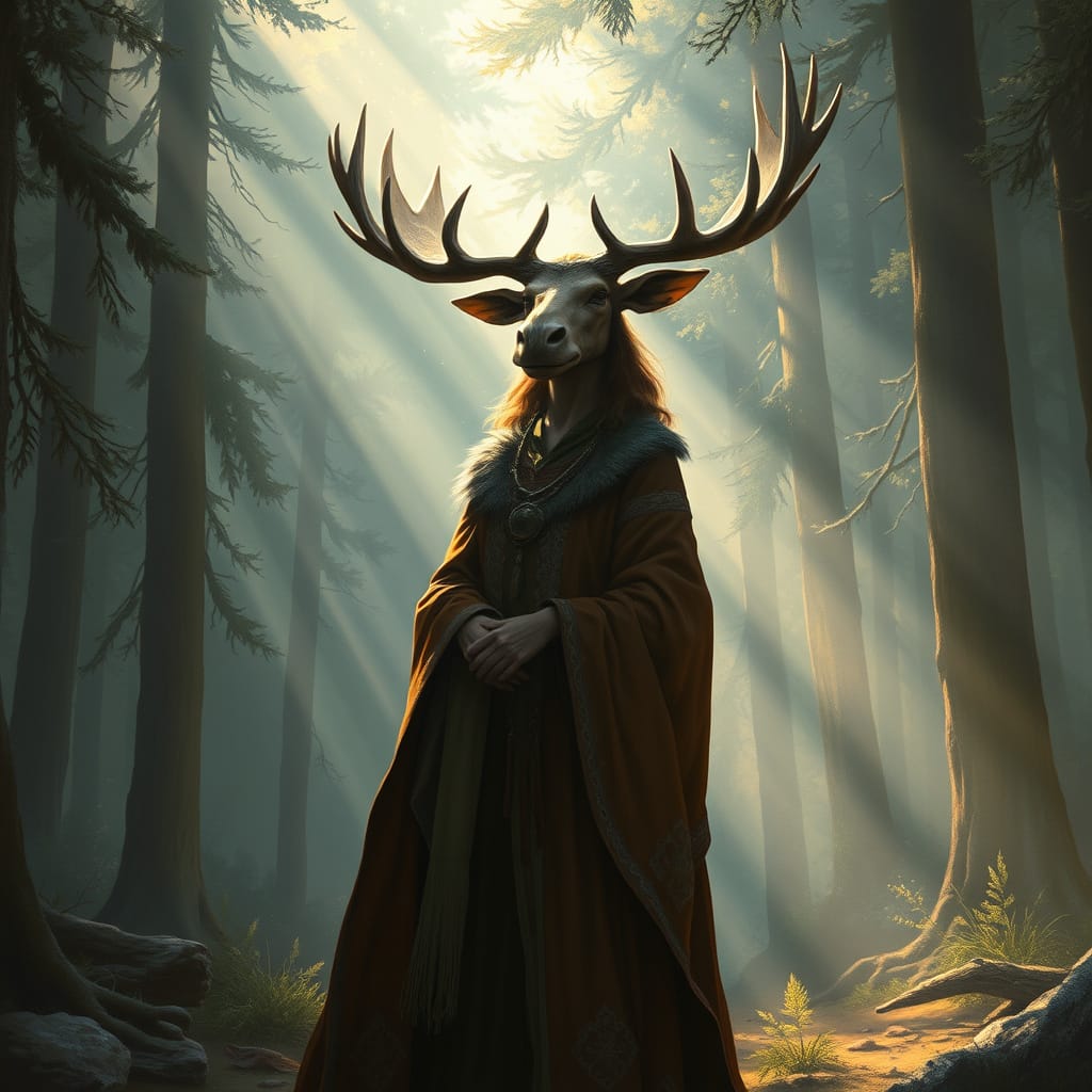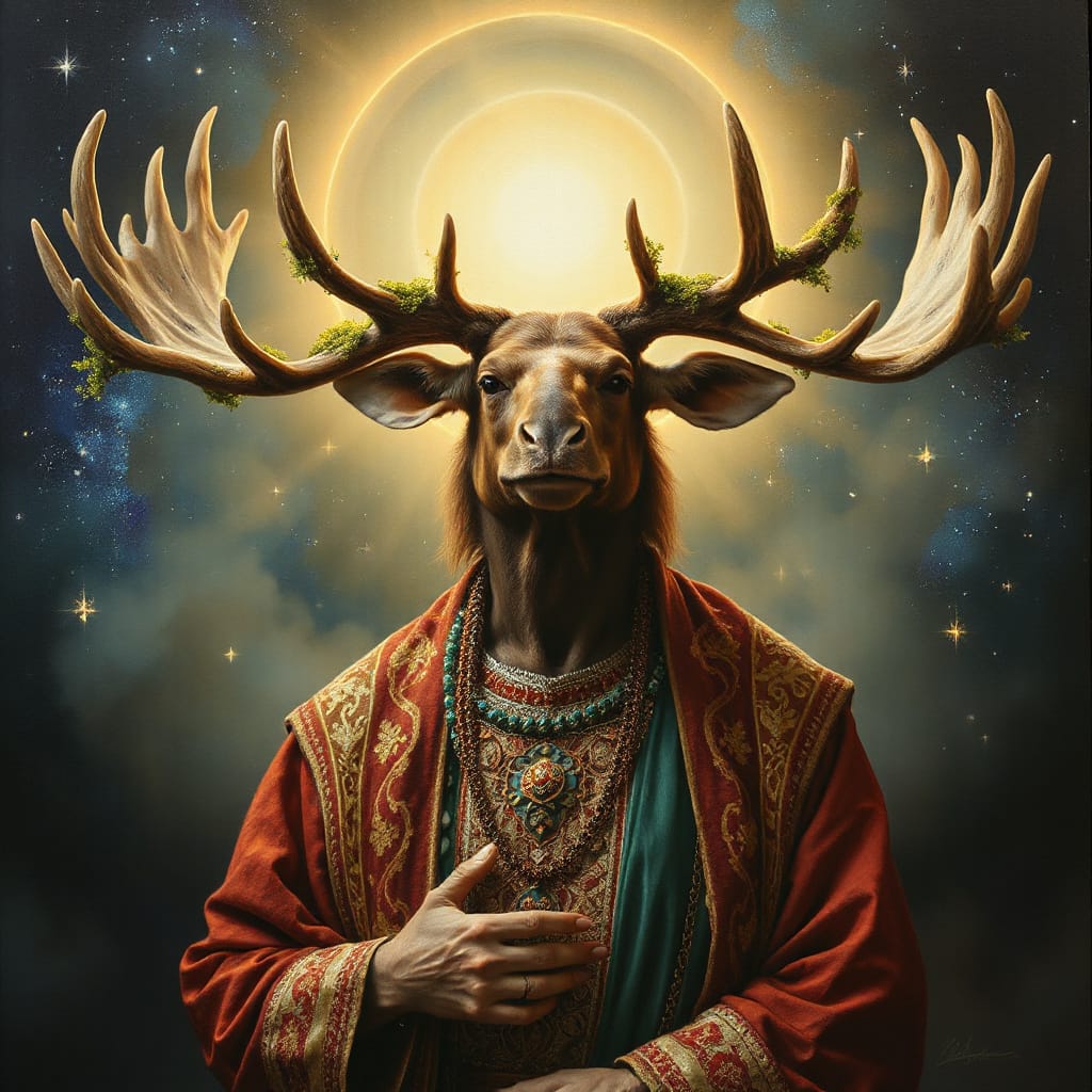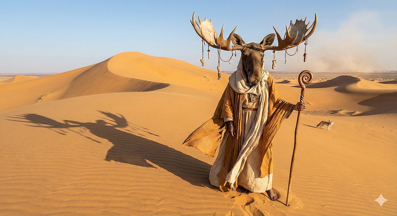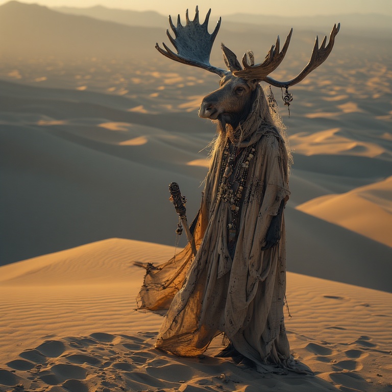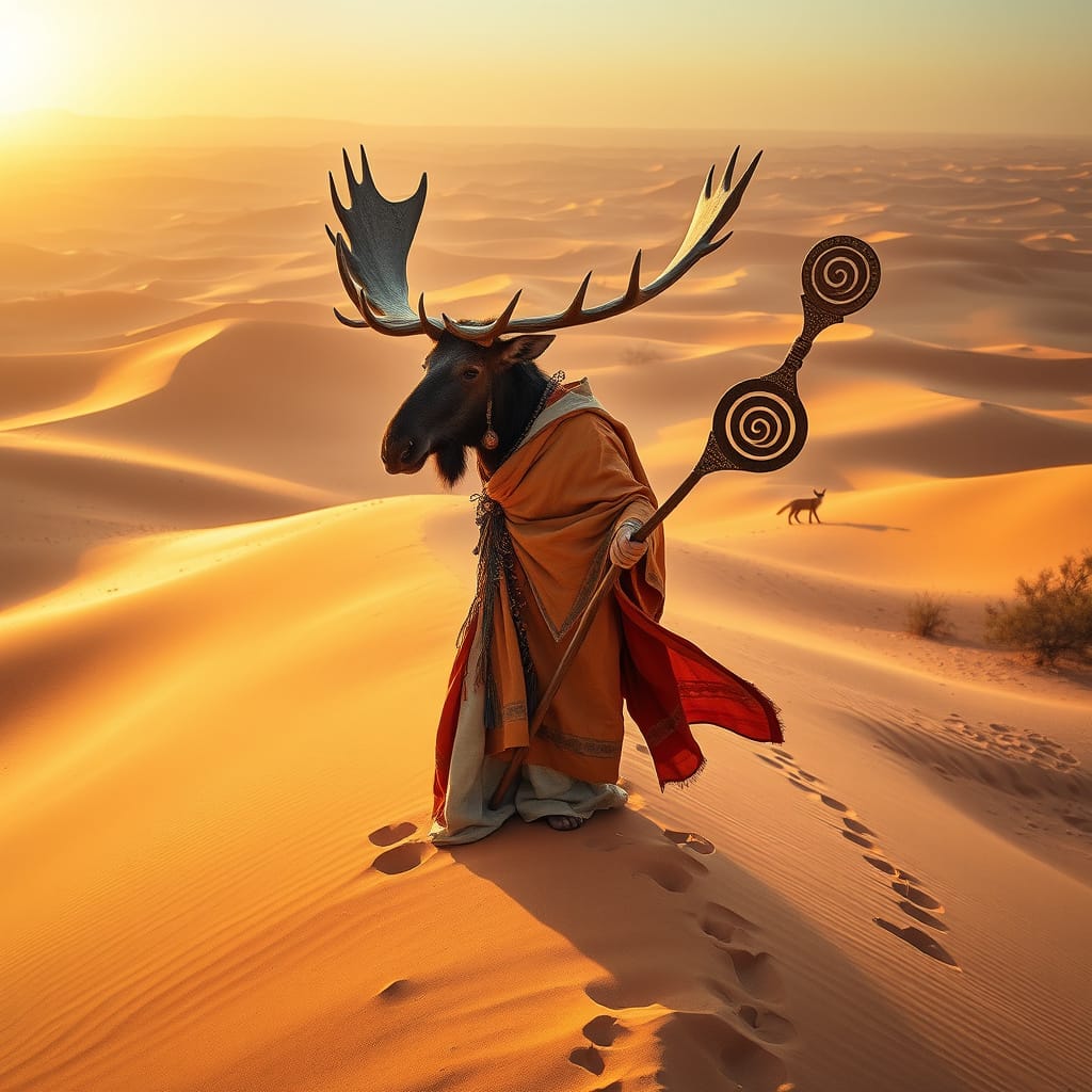 Our woman-moose-priestess stands on the crest of a massive dune. She is impossibly calm, regal, and ancient — a mythic presence in an arid world.