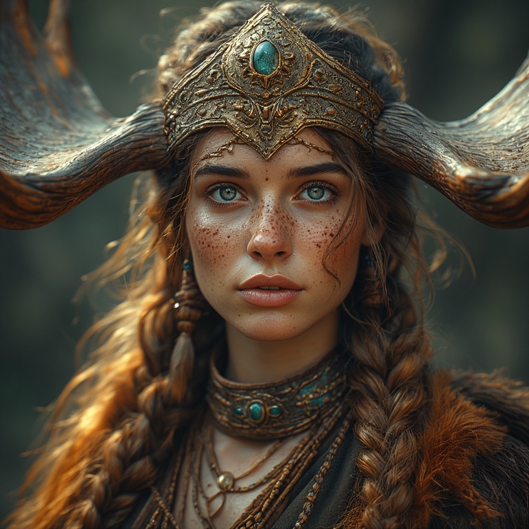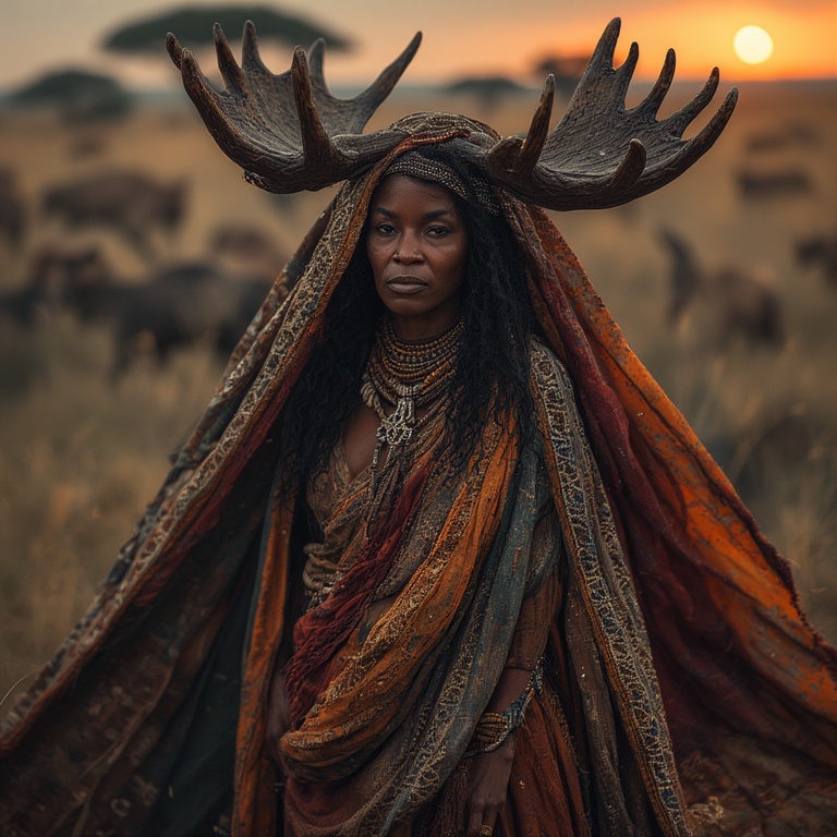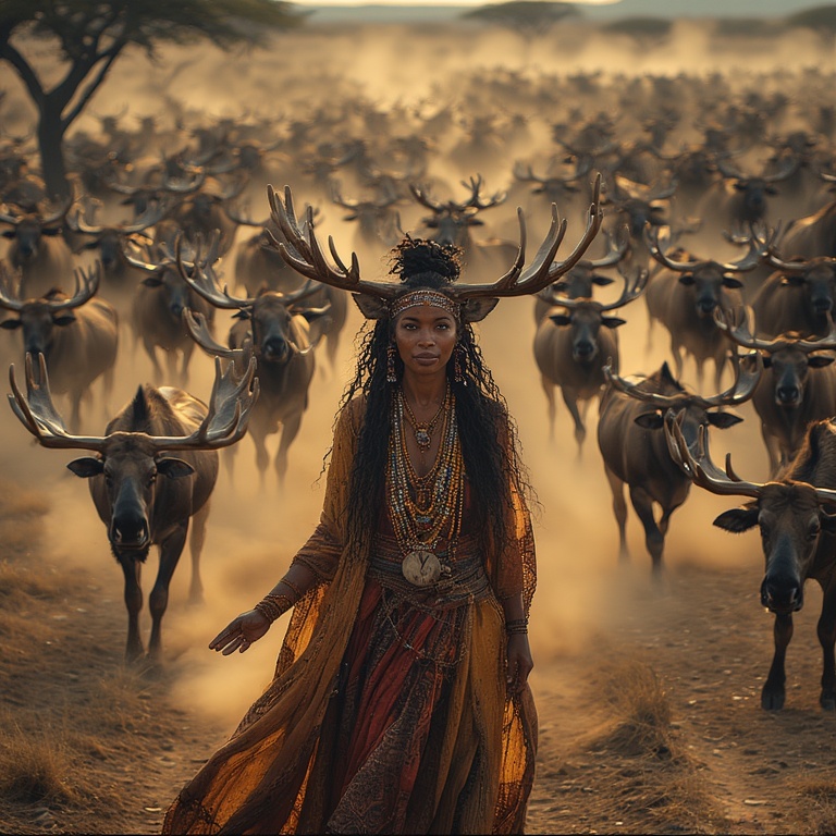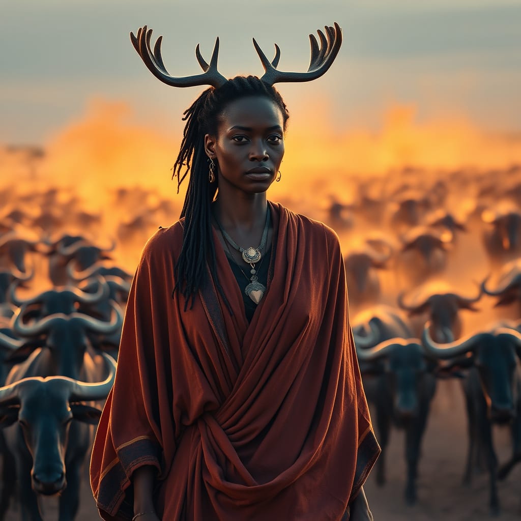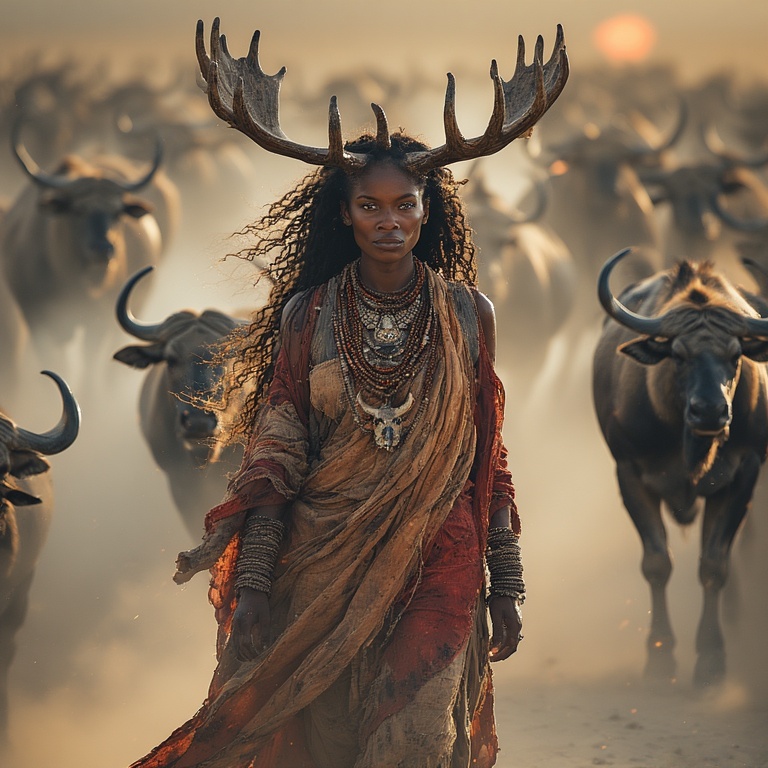 Mythic, serene, and profoundly grounded in natural beauty, our woman-moose-priestess stands with extraordinary stillness as the great herd rushes around her.