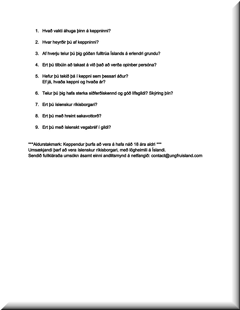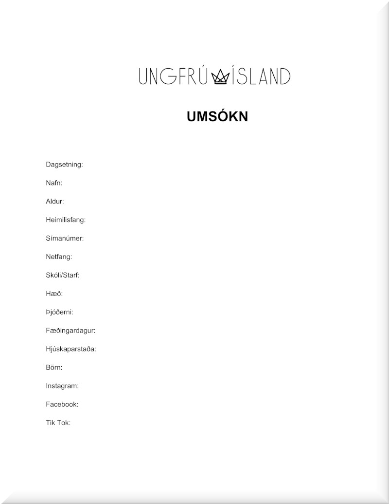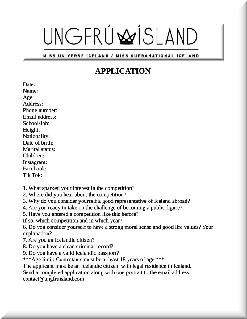 For the convenience of our WLBOTT followers, we’ve translated the Miss Iceland application to English. The original can be found at https://www.missuniverseiceland.com/apply