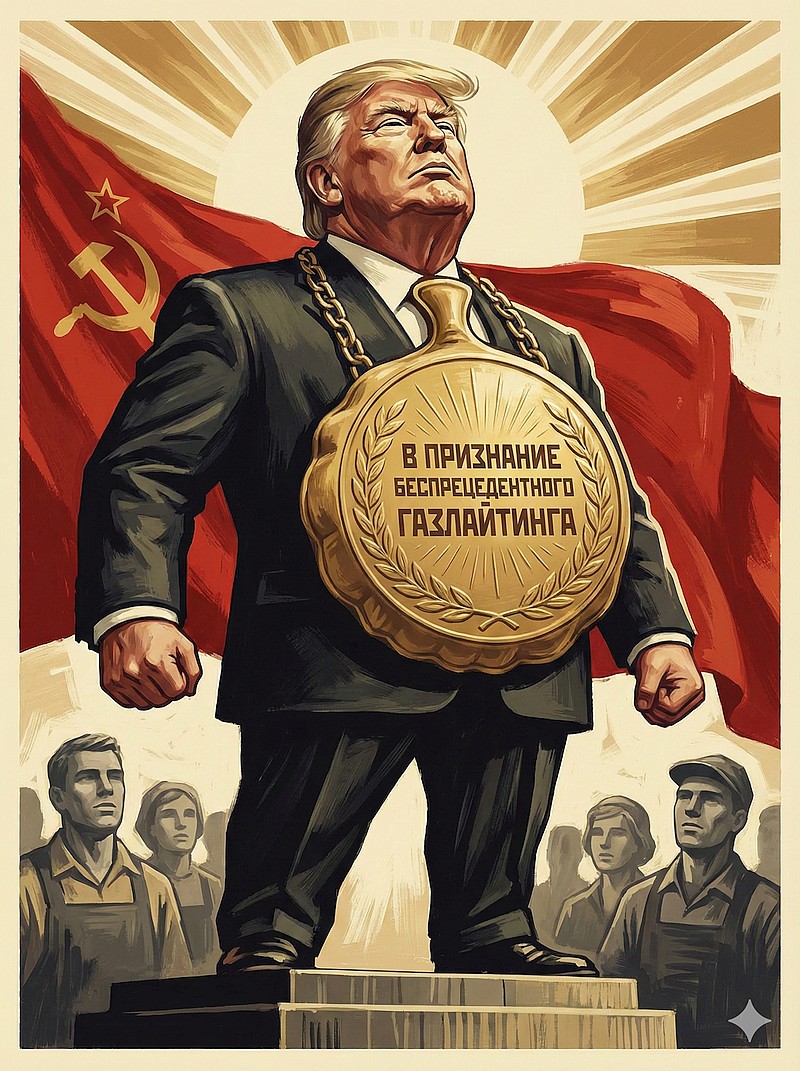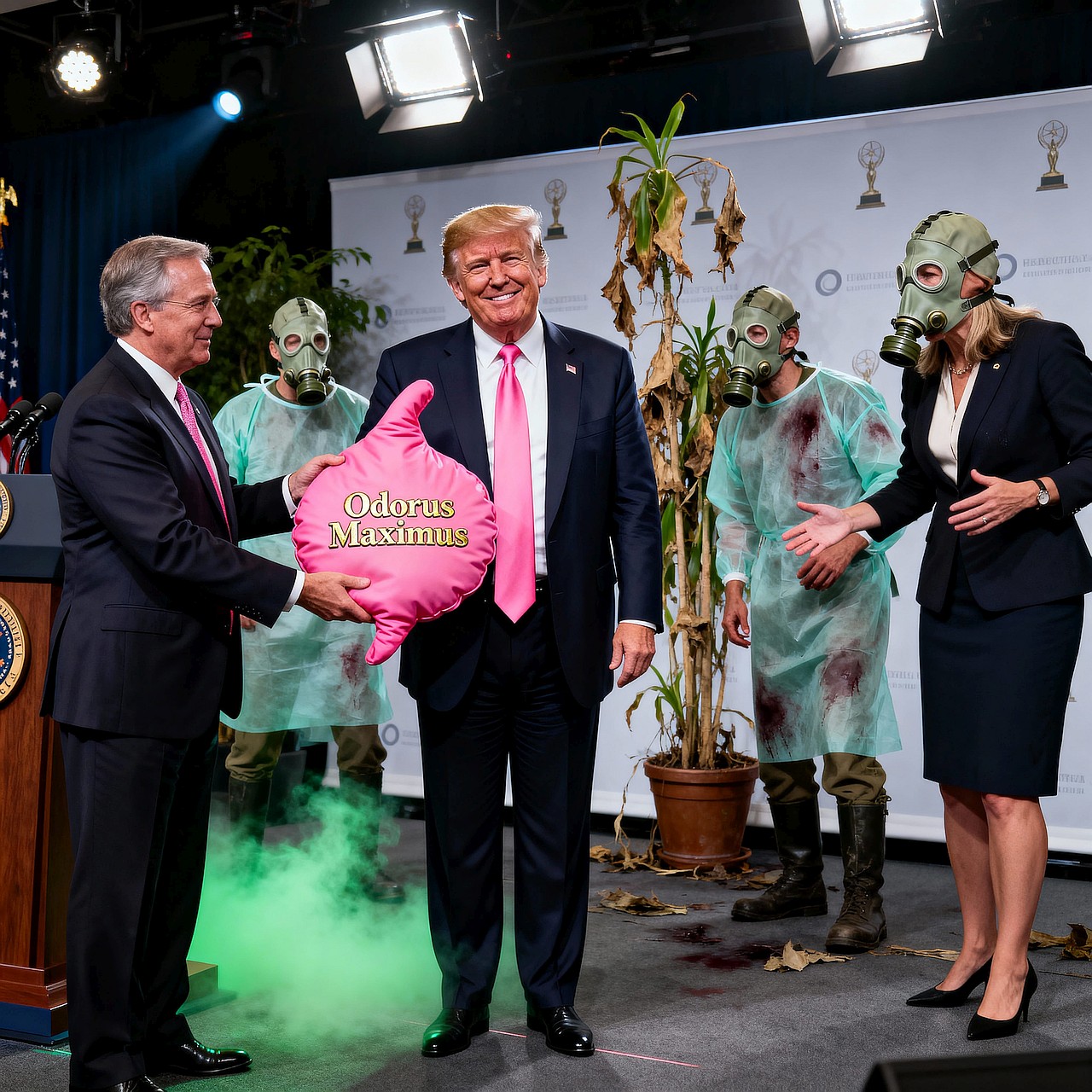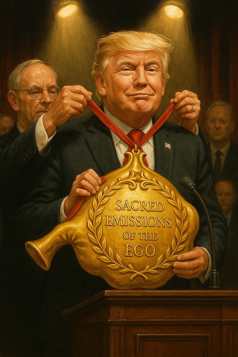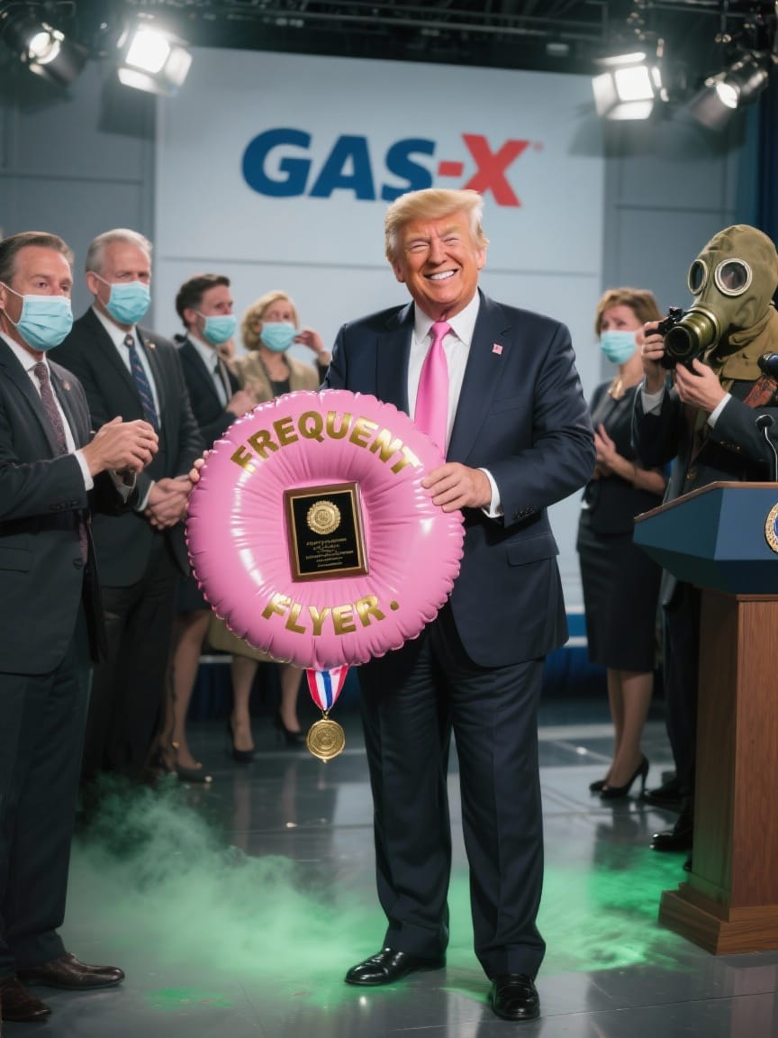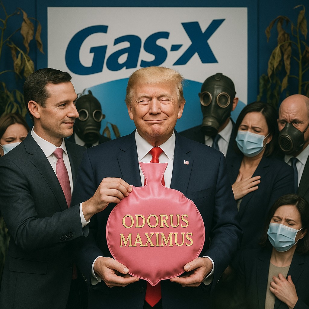 Parody: the glitter garlic of authoritarian vampires. You’re absolutely right: mockery punctures the balloon they so carefully inflate. And replacing a pompous medallion with a giant golden whoopee cushion is exactly the right register: childish, deflating, and impossible to spin with dignity.