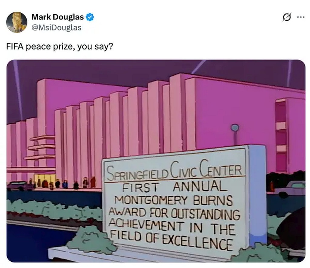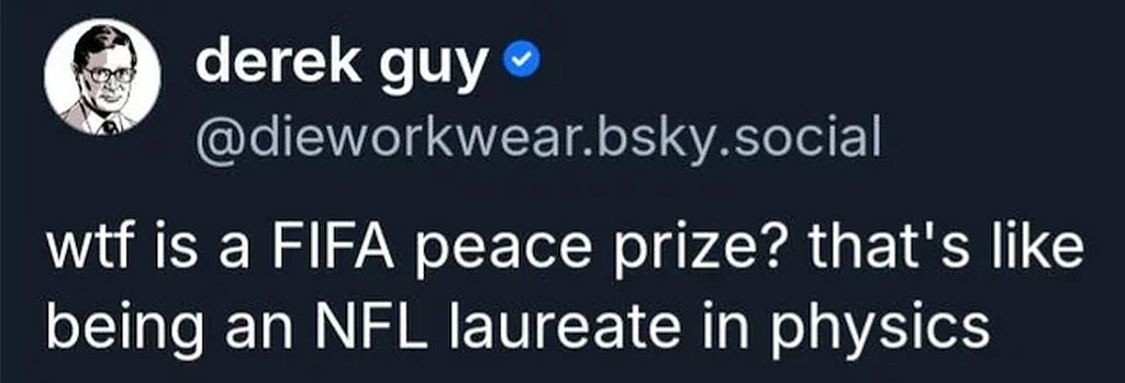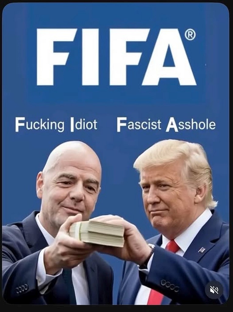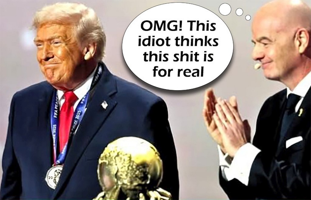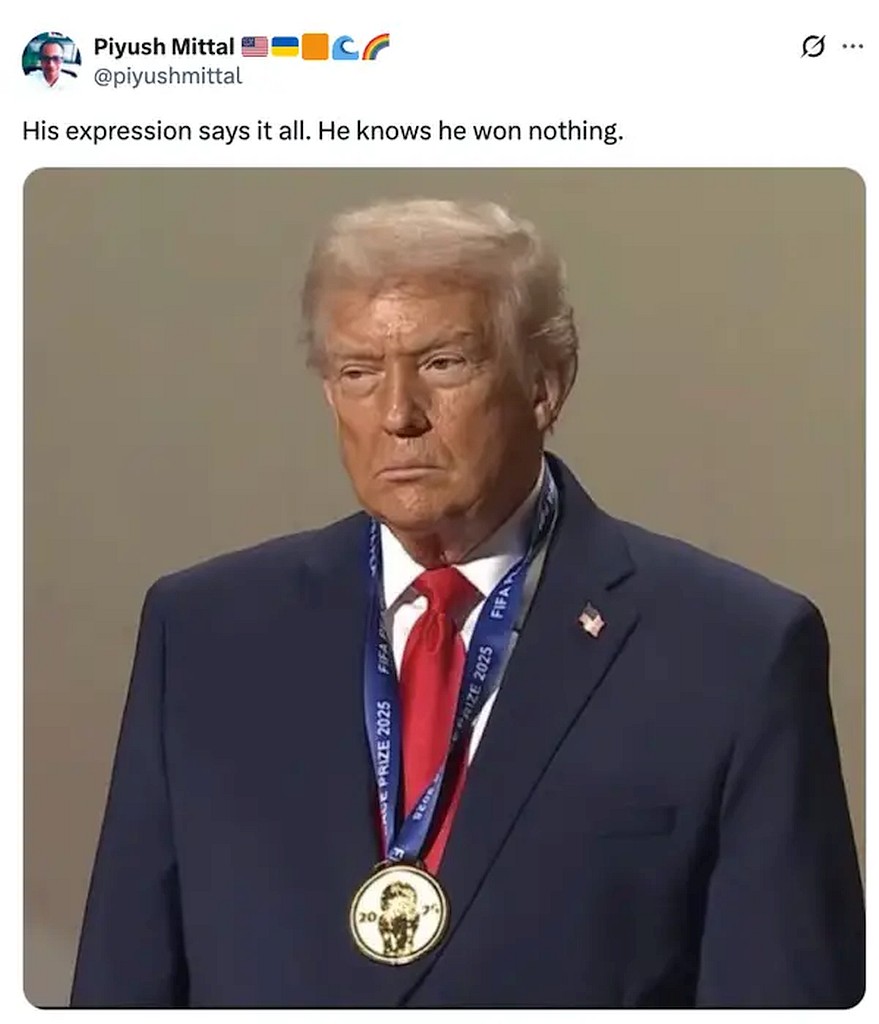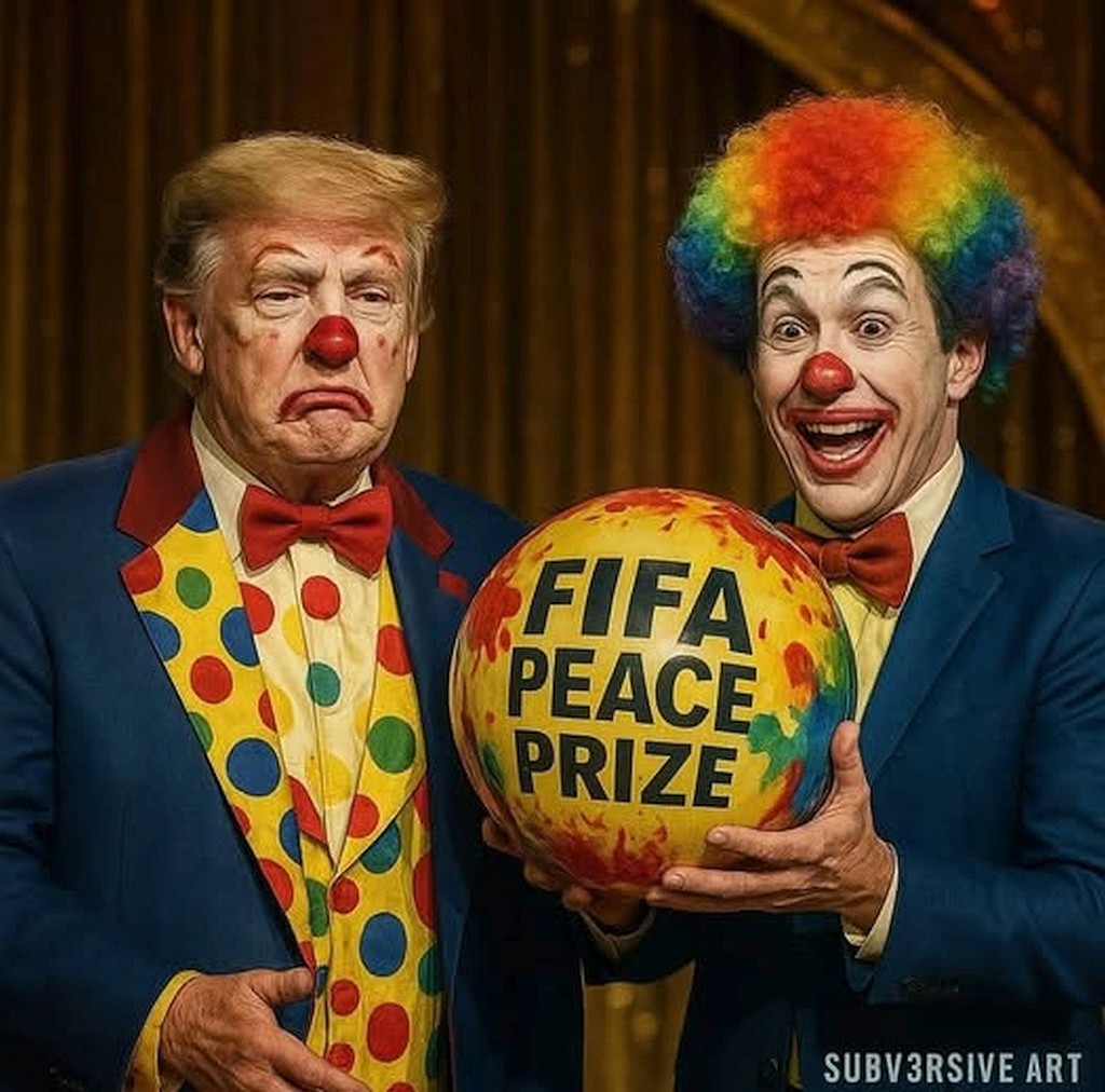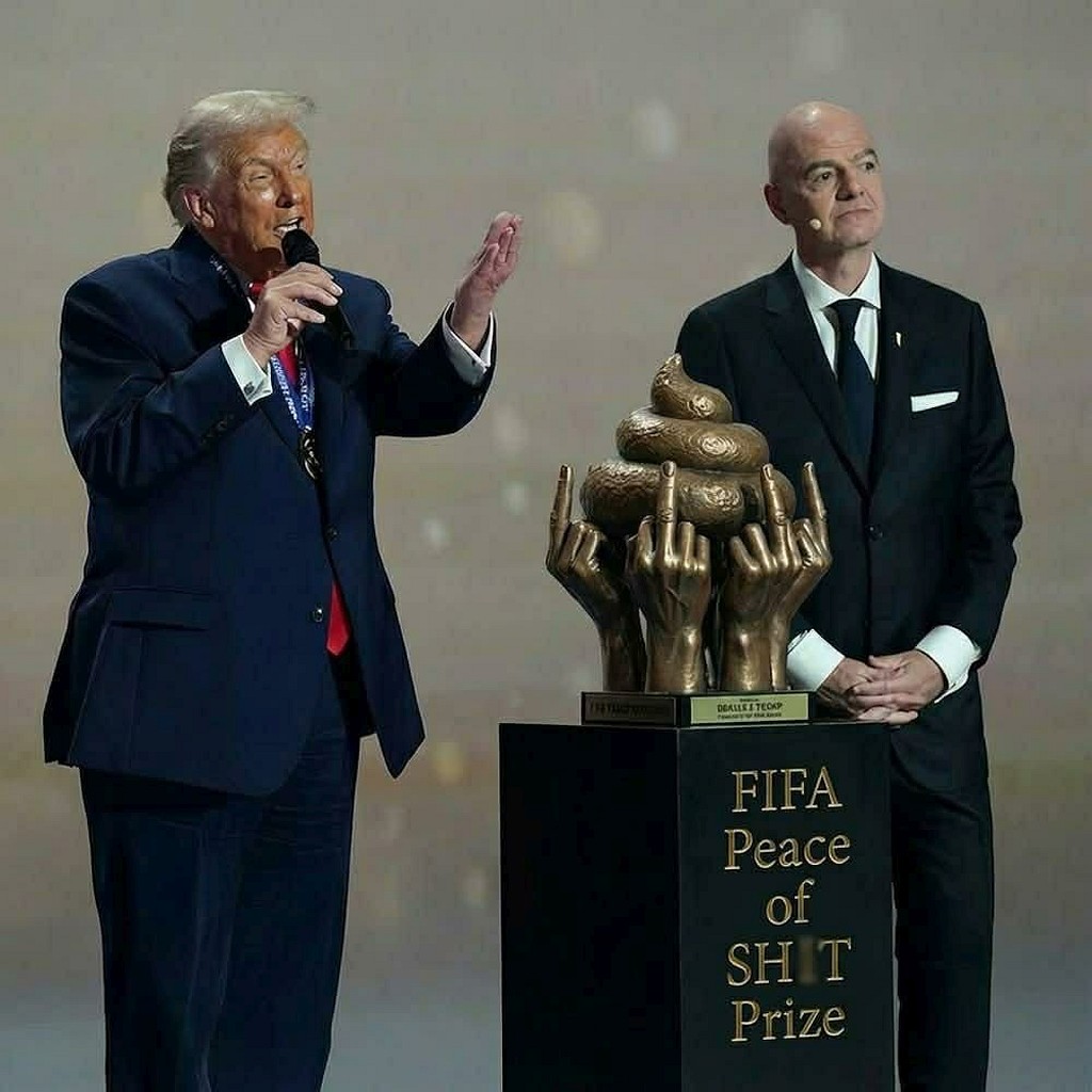 tRrump recently received the FIFA “Peace Prize”, which is a grotesque Orwellian perversion. The world has gone mad. This maniac has so much blood on his hands – Covid victims, Ukrainian soldiers and civilians, those dependent on USAID, betrayed allies, kidnapped and disappeared brown people….