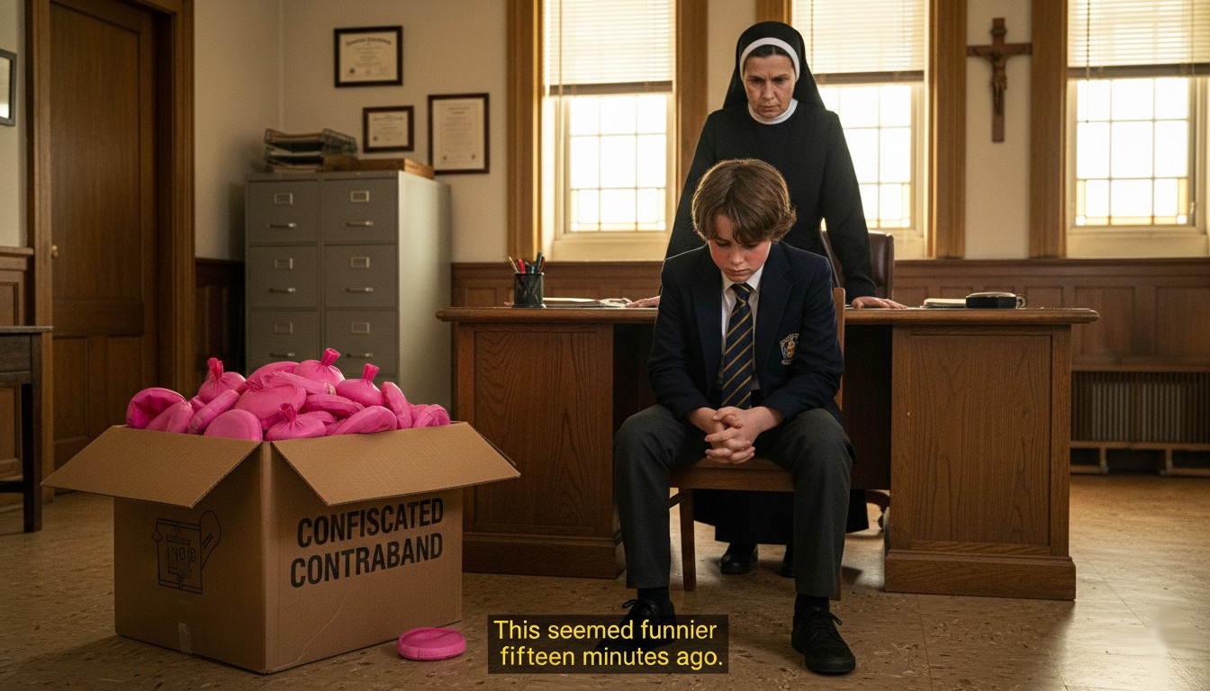He reasoned that distributing whoopee cushions during Sister M’s presentation would not mock the saint but honor historical accuracy. The sounds echoing through the assembly hall were, to Fred’s mind, a kind of pneumatic chant. Not disruption but devotion. Not prank but praxis.
