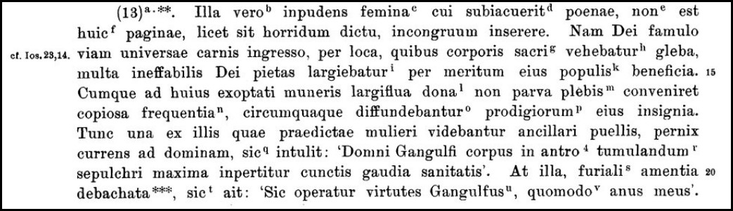 XIII: Moreover, it befits our story to say what punishment was inflicted on that awful woman, although it is horrible to speak of. For after the servant of God had gone the way of all flesh, the unknowable piety of God bestowed many benefits to the people everywhere where the soil of his sacred body was taken because of Gangulf’s merits. And when a large crowd of people had come to the free-flowing benefits of this desired gift, signs of his wonders were poured forth in every direction. Then, one of the maids of the aforesaid woman ran swiftly to her mistress, and said ‘The body of lord Gangulf is imparting the greatest benefits of health to everyone from his tomb!’ But his wife, with insane stupidity, said ‘If Gangulf can do miracles, so can my arse!’ As soon as this had left her wicked mouth, a thunderous fart came from the darkest part of her body. It is the Christian habit to call the day when this took place a ‘Friday’. And afterwards she was subjected to a great punishment on every Friday for the rest of her life. That is, each time she spoke, that part of her body to which she had disrespectfully compared the miracles of the man of God farted.