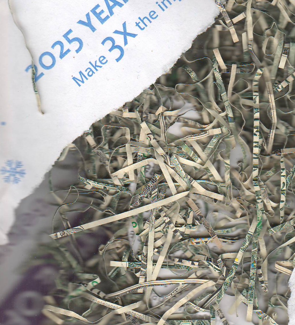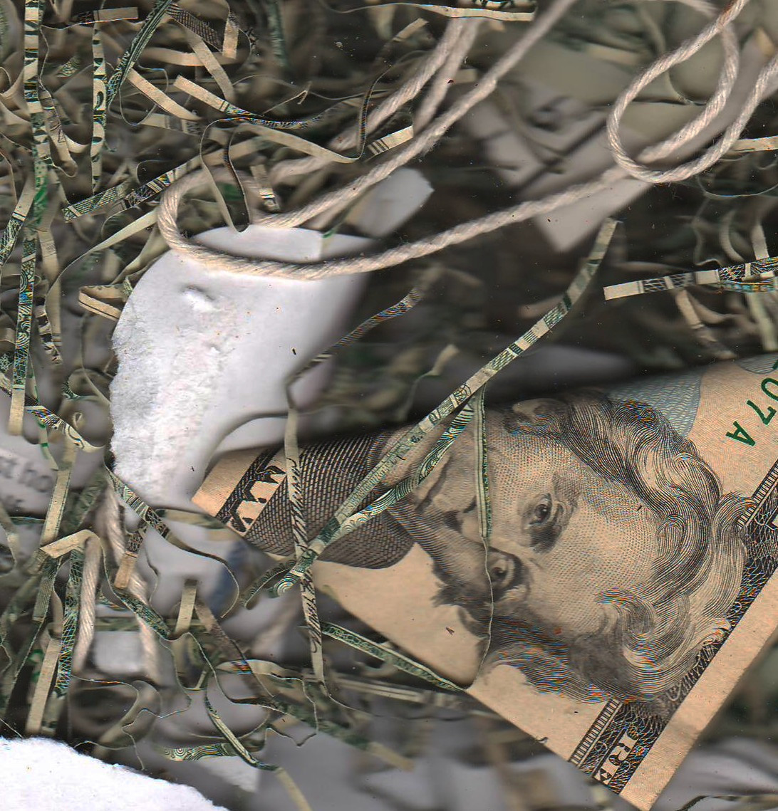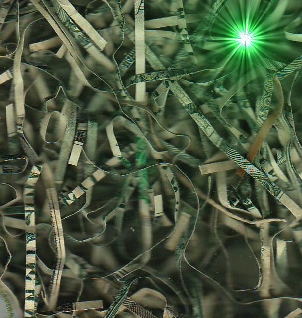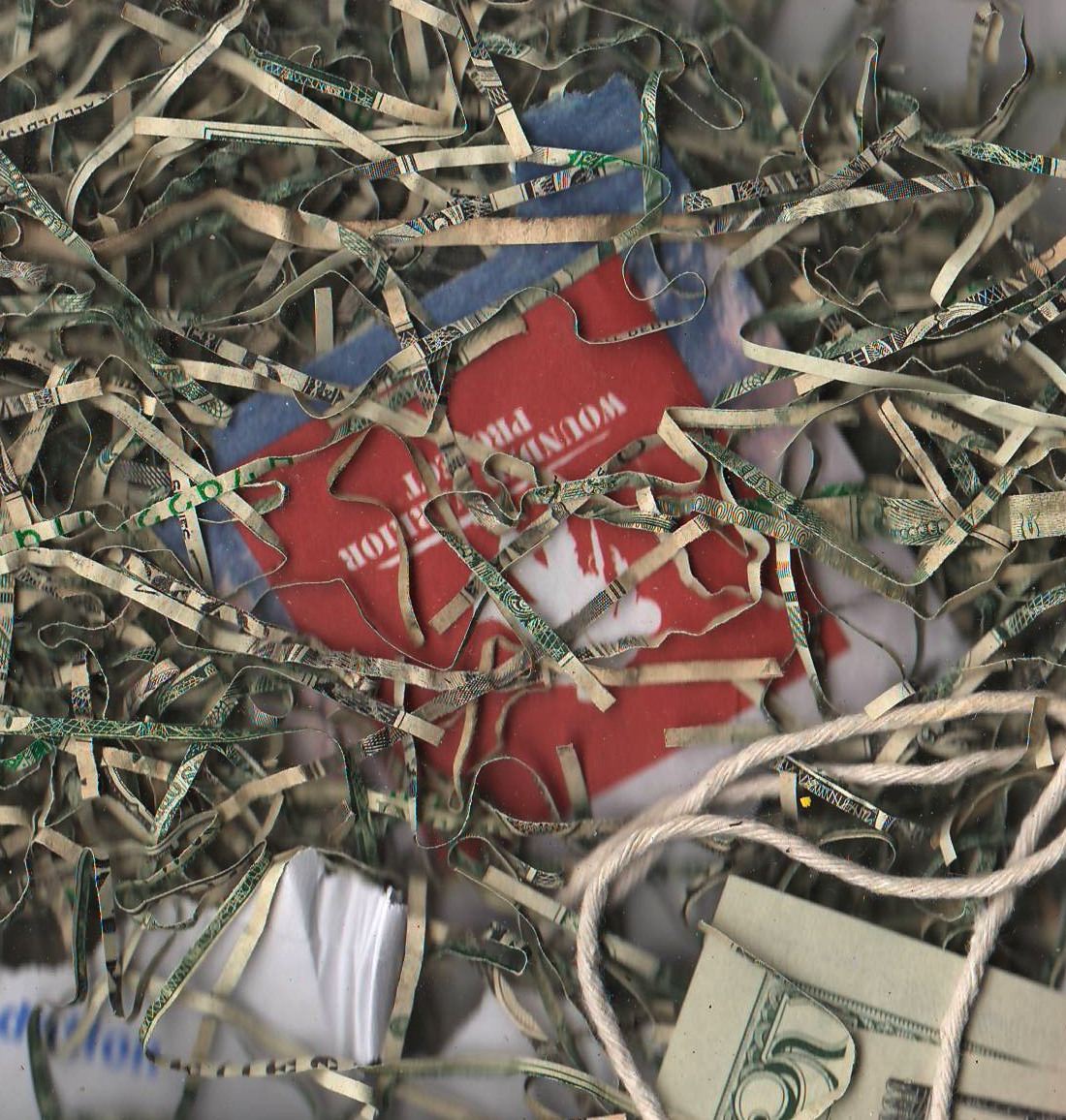 But Fred grew restless and his mind began to wander. He recalled a lecture from Sister Flugelhorn, the art teacher at St. Gangulf Middle School. She described the work of Vik Muniz, a Brazilian artist who repurposed trash and waste into art. And he did a series using shredded U.S. currency!