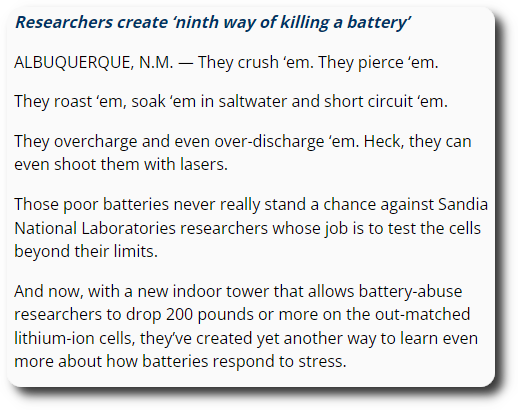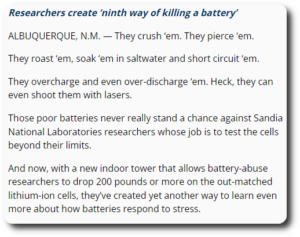 We also learned of the Sandia National Lab’s Battery Abuse Testing Lab. “I traveled to the Sandia National Laboratories…. Here, they do all the things those warning labels tell you not to do.” – PBS Nova Documentary