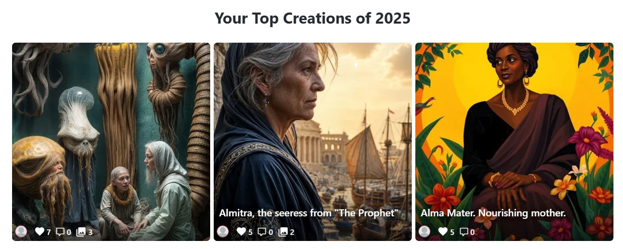 Early in 2025, we primarily used NightCafe for our image generation, but later in the year we found incredible AI image generation through Gemini and Elder G‘s cousin, Sora.