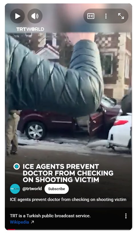 ICE agents prevented a bystander who identified himself as a physician from providing medical aid to the driver. No medical aid was provided for about 15 minutes and when medical first responders arrived, their vehicles could not access the site because of the ICE vehicles and they had to walk to the driver.