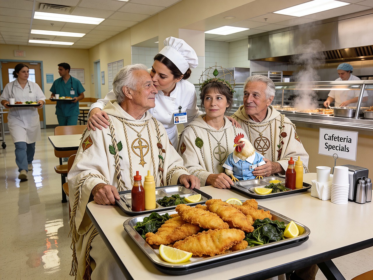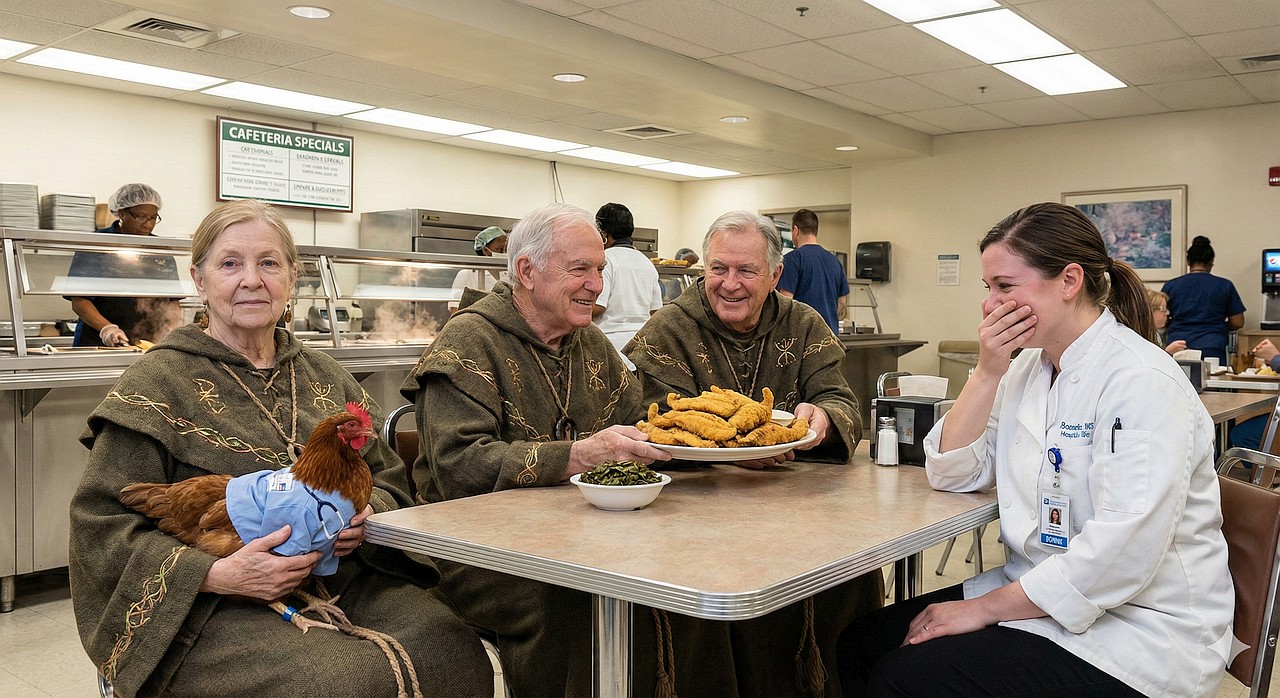 Since Elder JimZim was in town, we joined Sally for lunch at the hospital cafeteria. The day just kept getting better and better – the special of the day was fried catfish and collard greens.