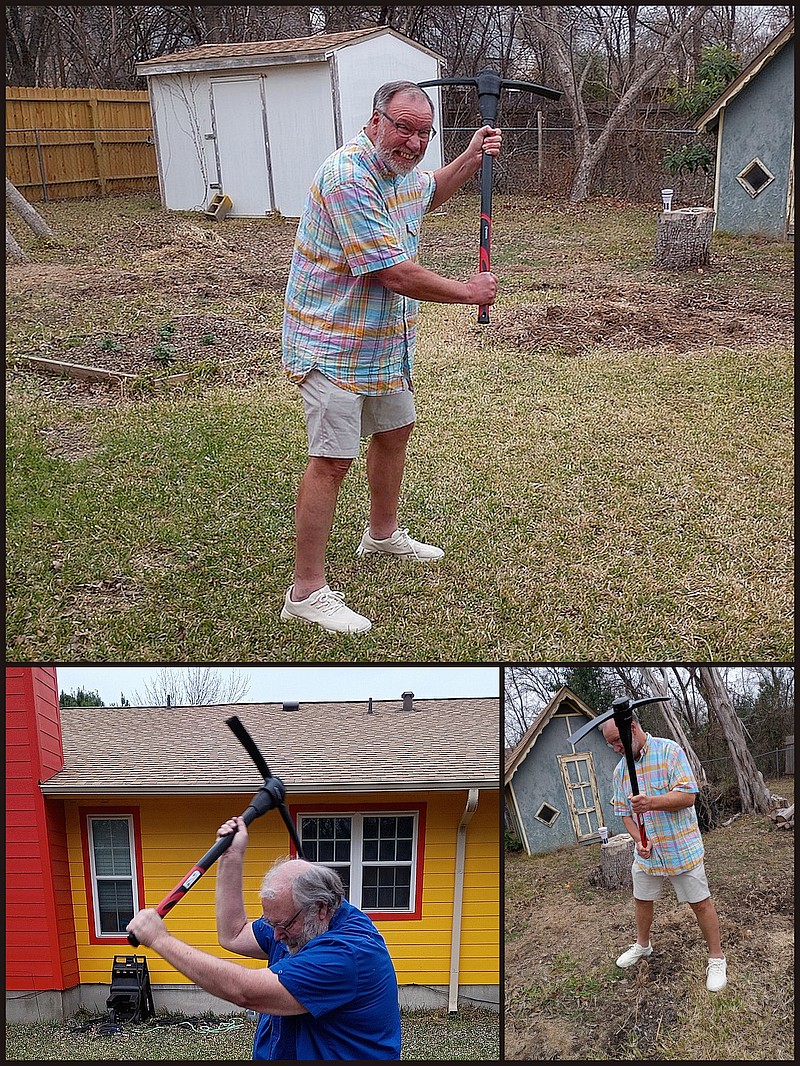 Elder JimZim surveyed the WLBOTT Agricultural Extension Service experimental hybrid garden. As luck would have it, our pickax arrived from Amazon during his visit.