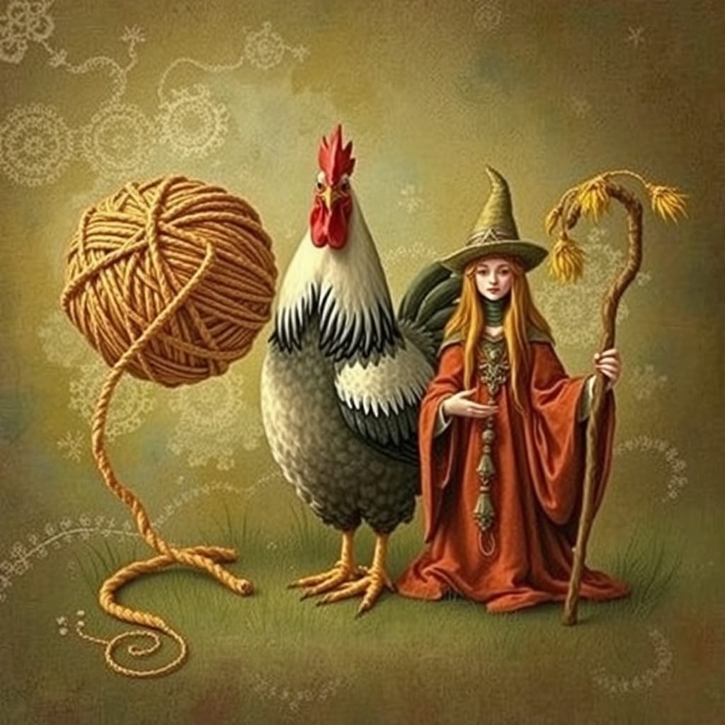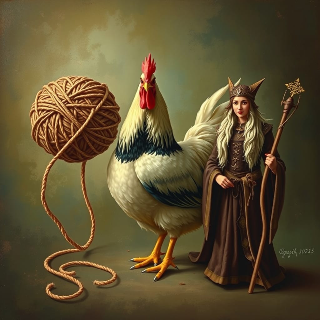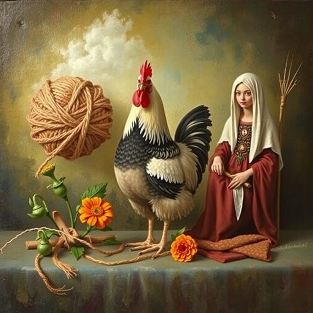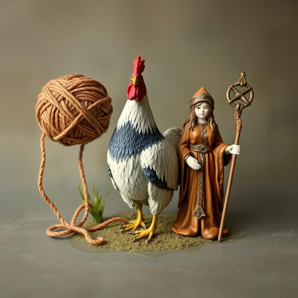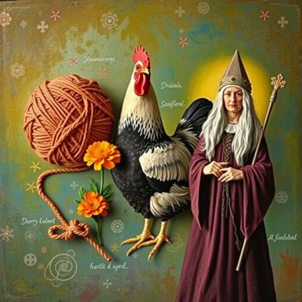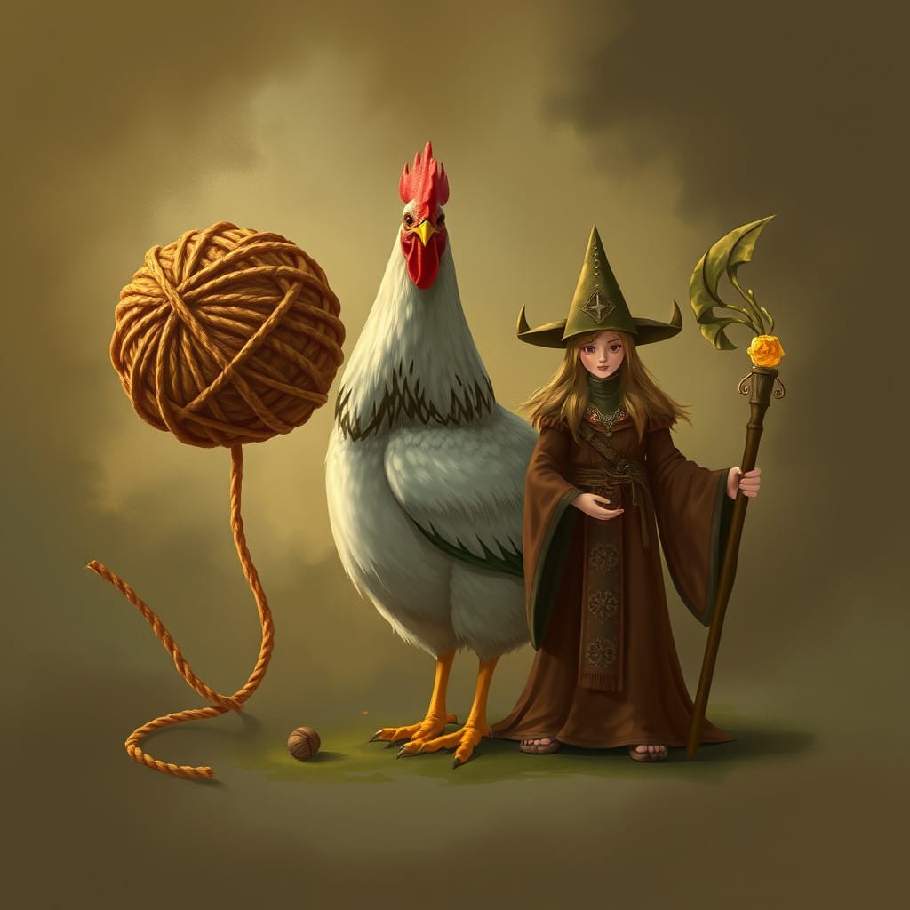 Prompt: A ball of twine, a chicken, [a marigold,] and a druid priestess.