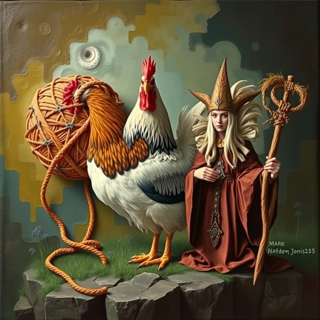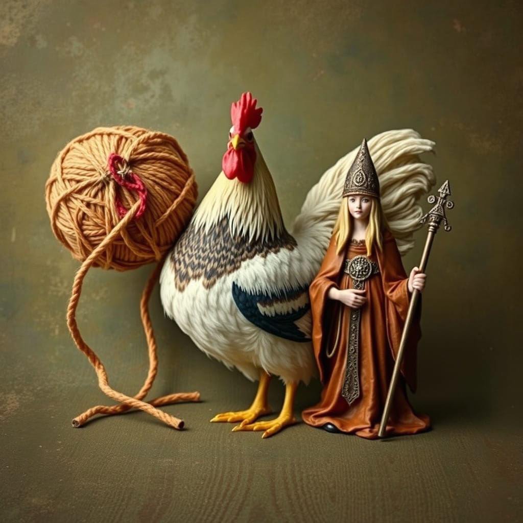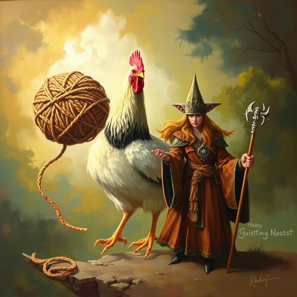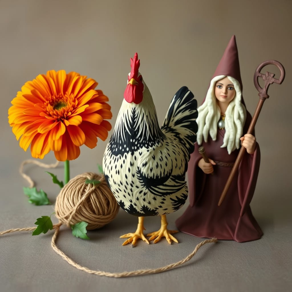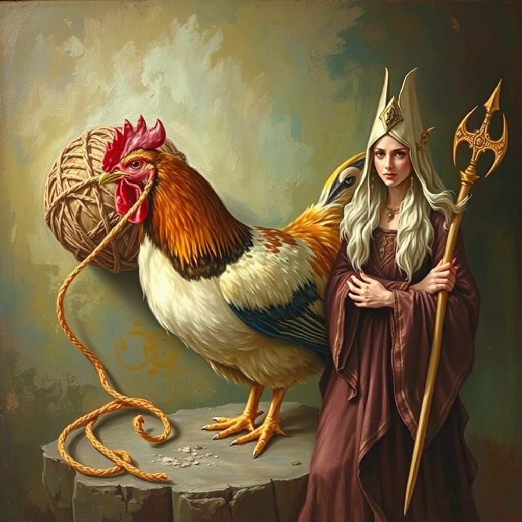Prompt: A ball of twine, a chicken, [a marigold,] and a druid priestess.