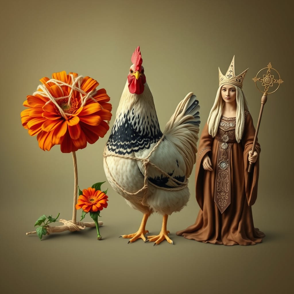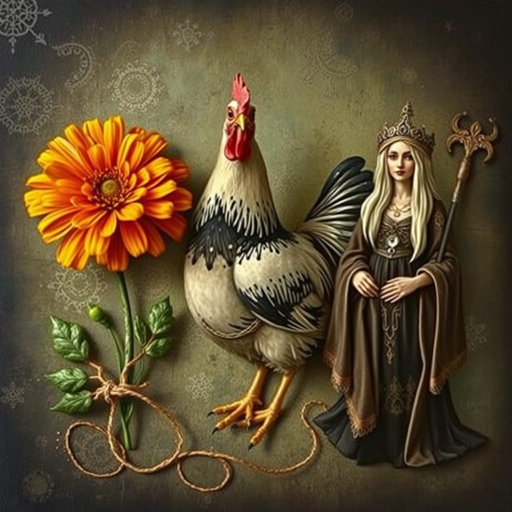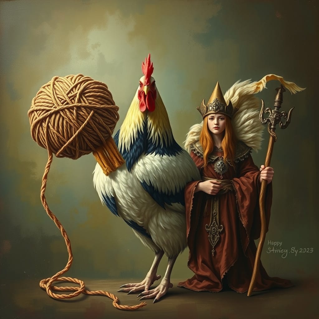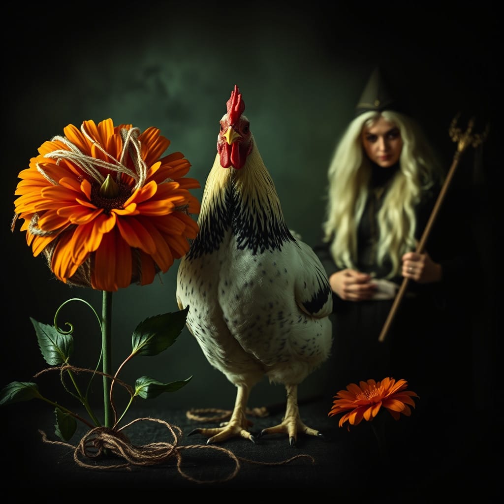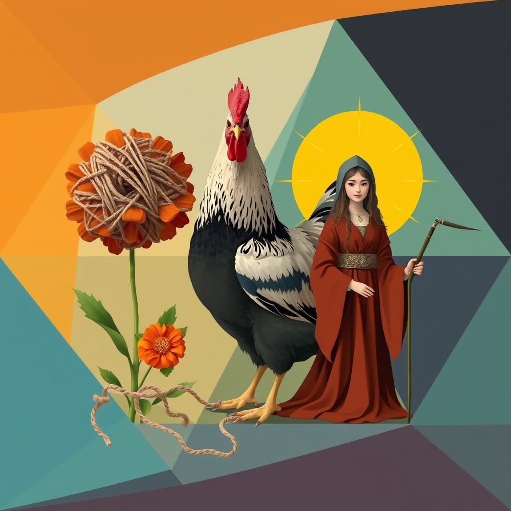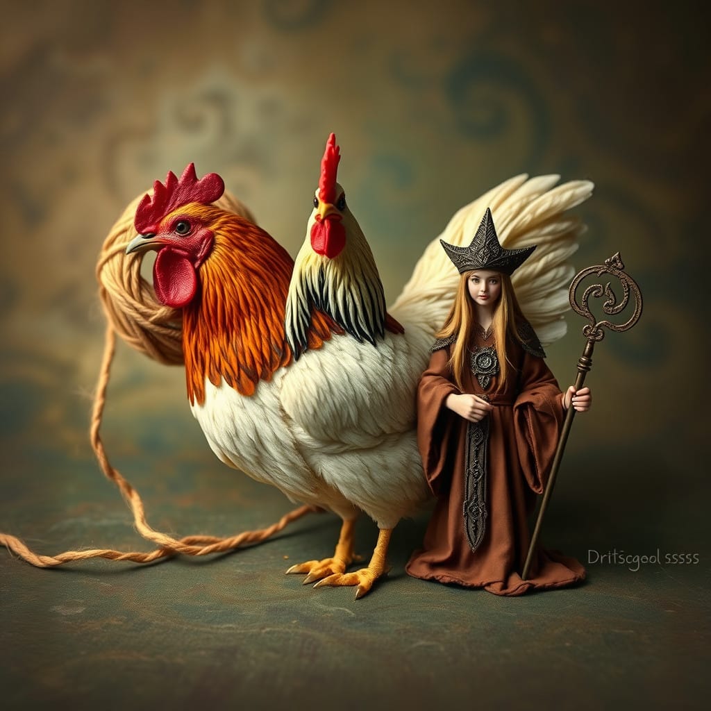 Prompt: A ball of twine, a chicken, [a marigold,] and a druid priestess.
