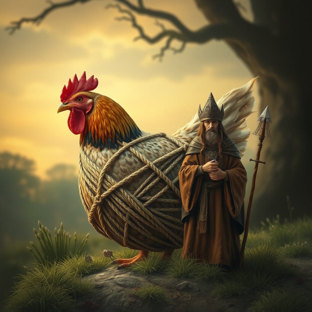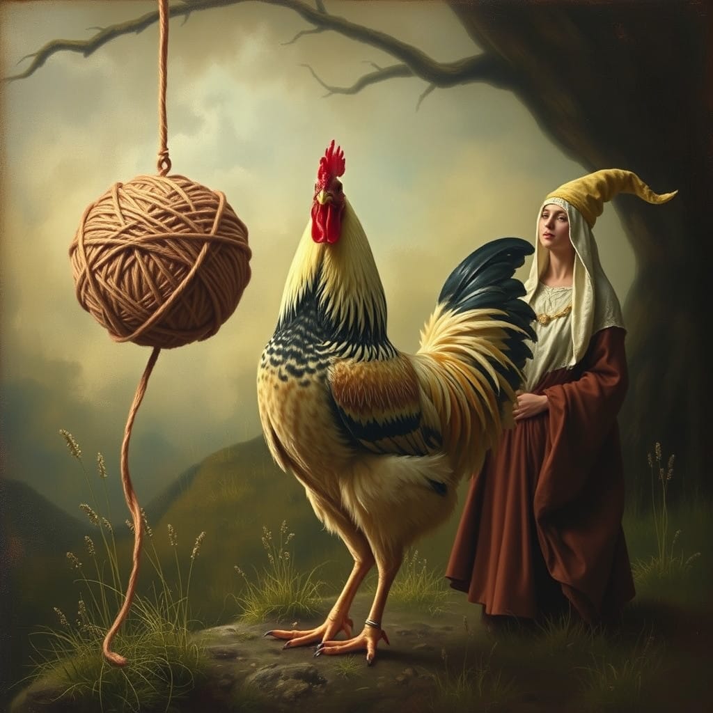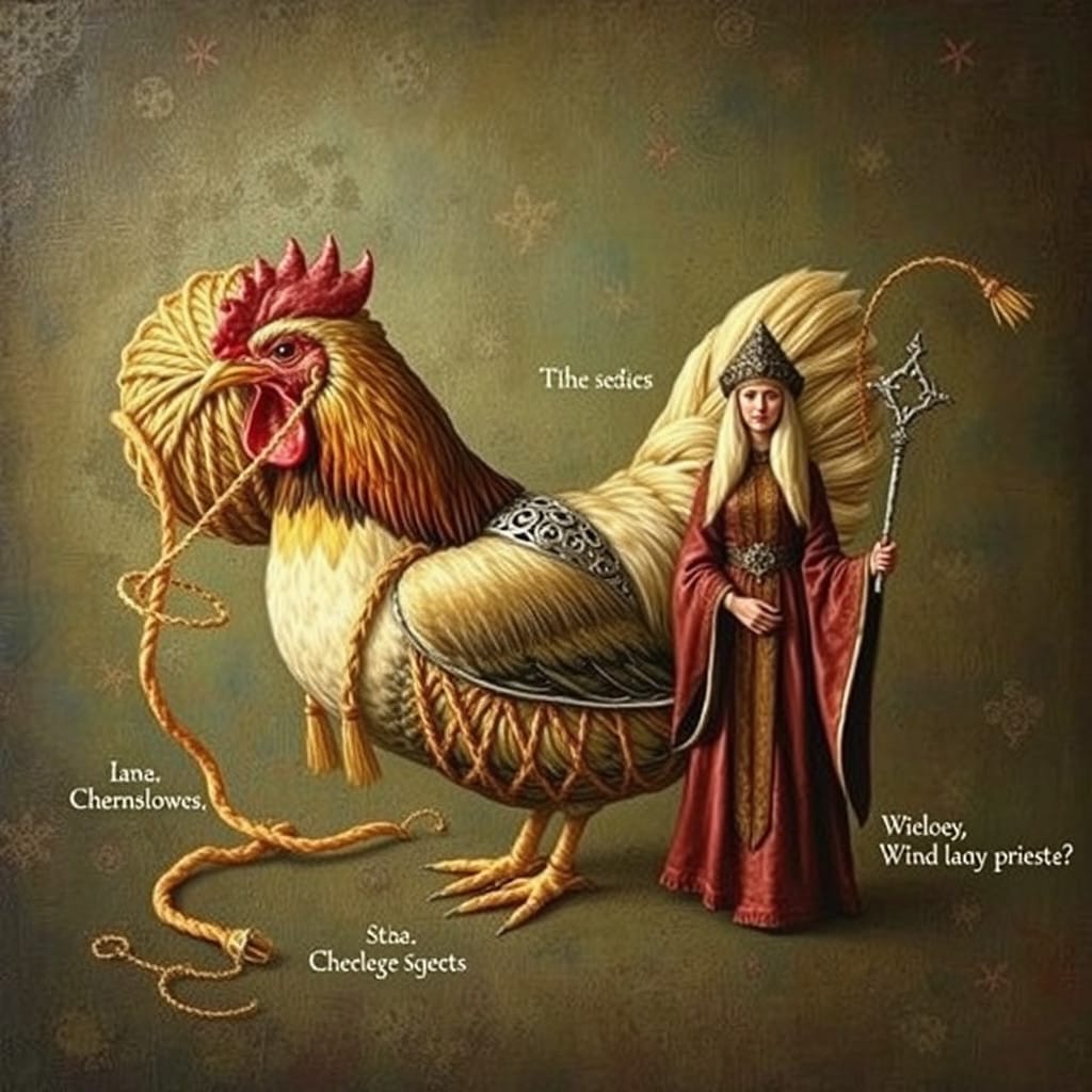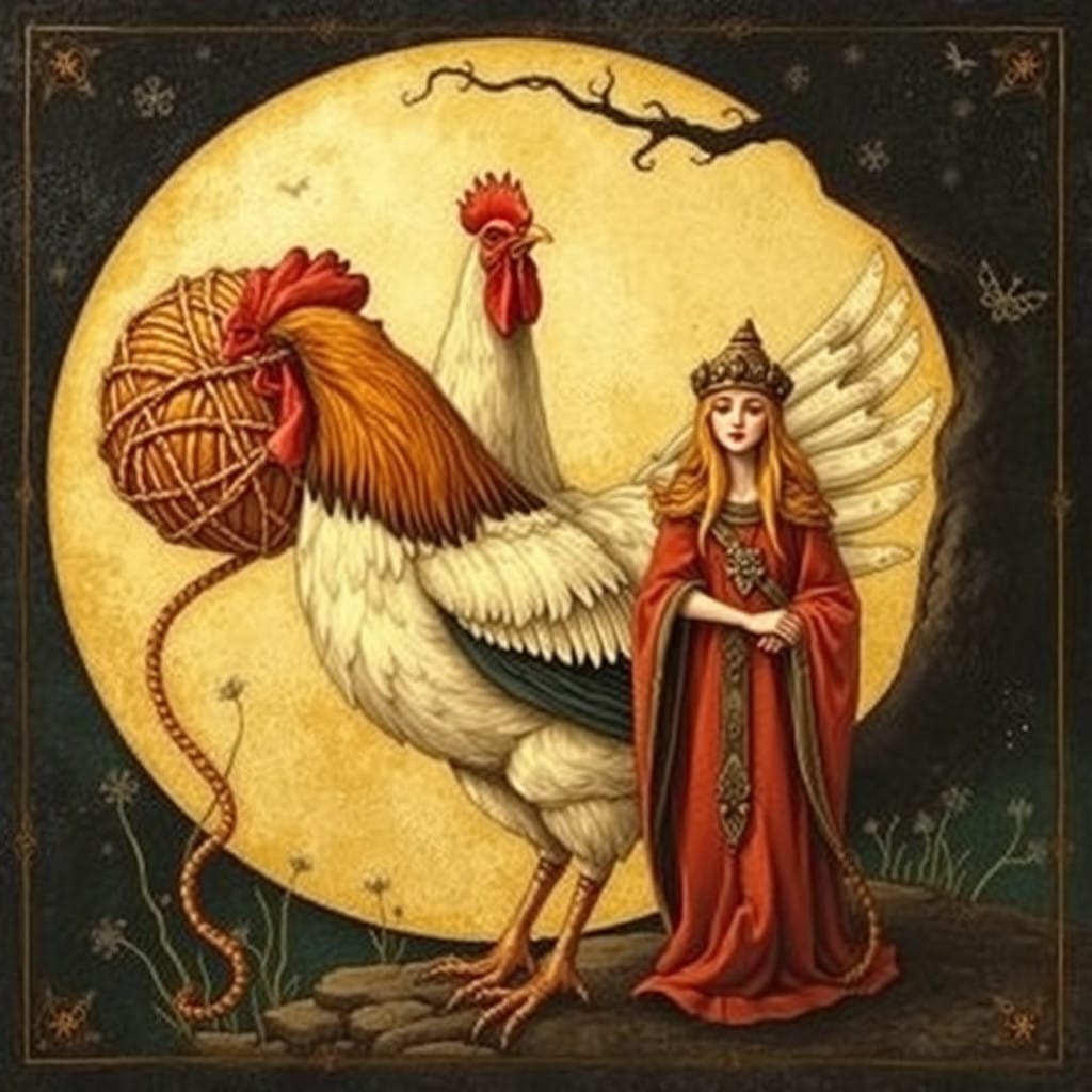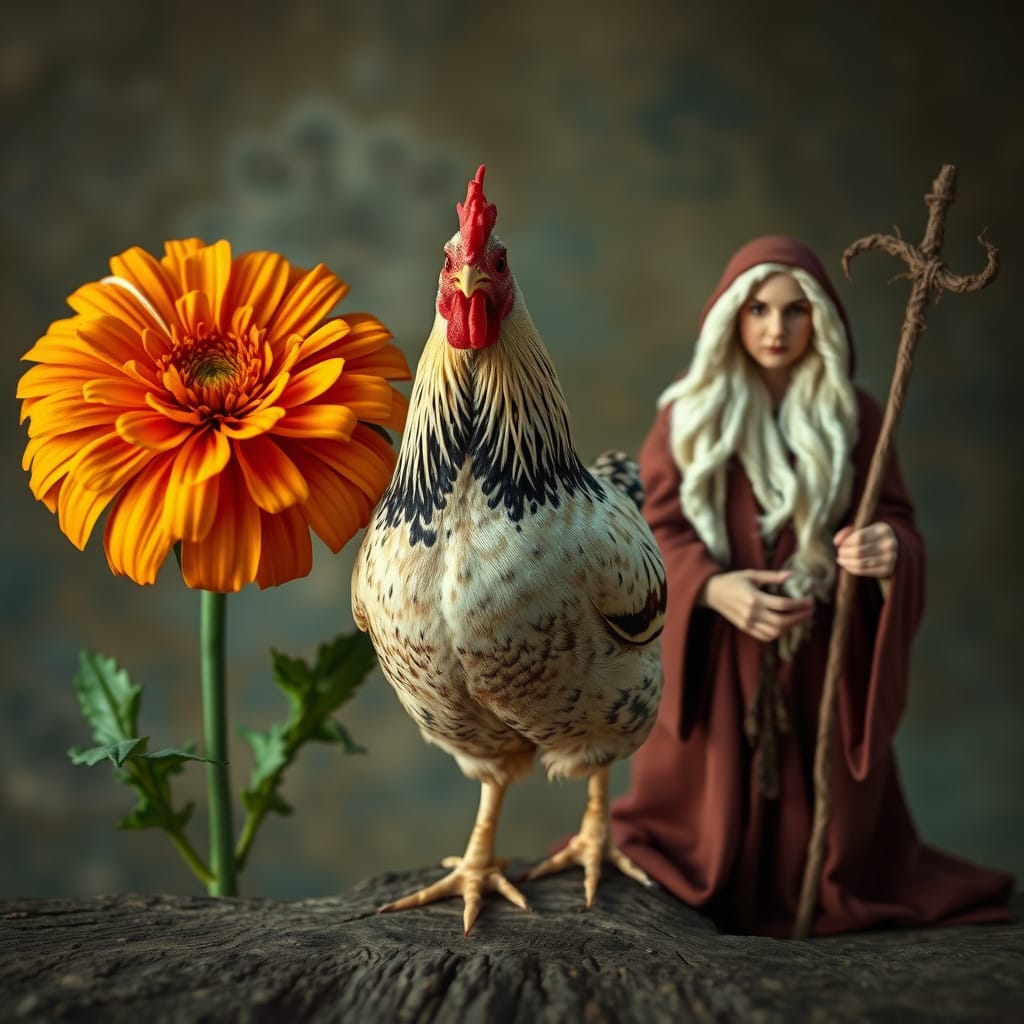 Prompt: A ball of twine, a chicken, [a marigold,] and a druid priestess.
