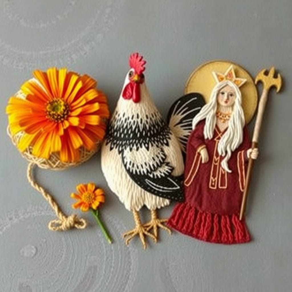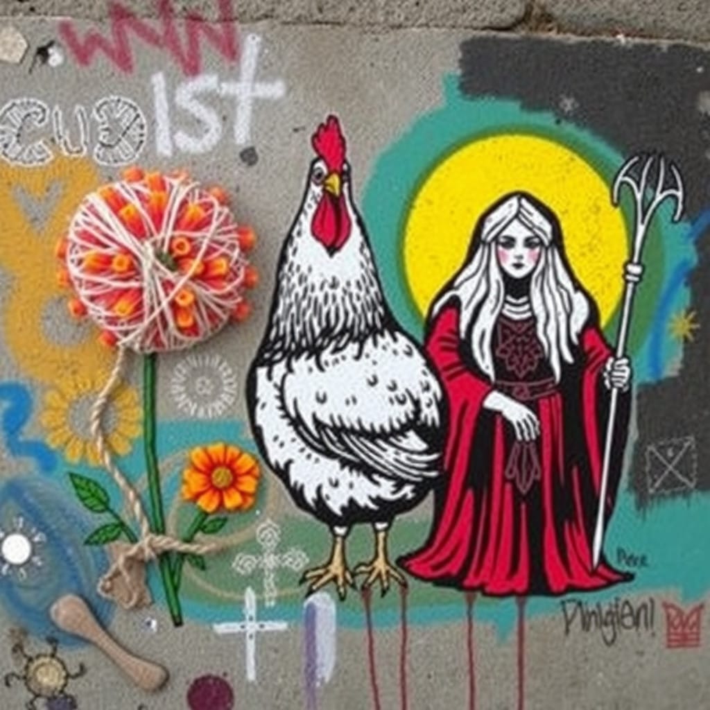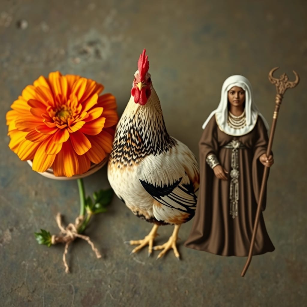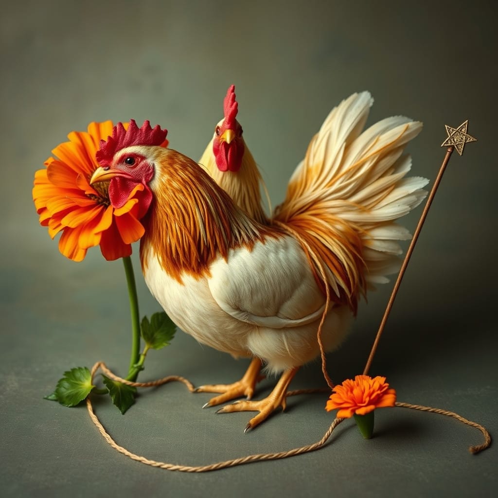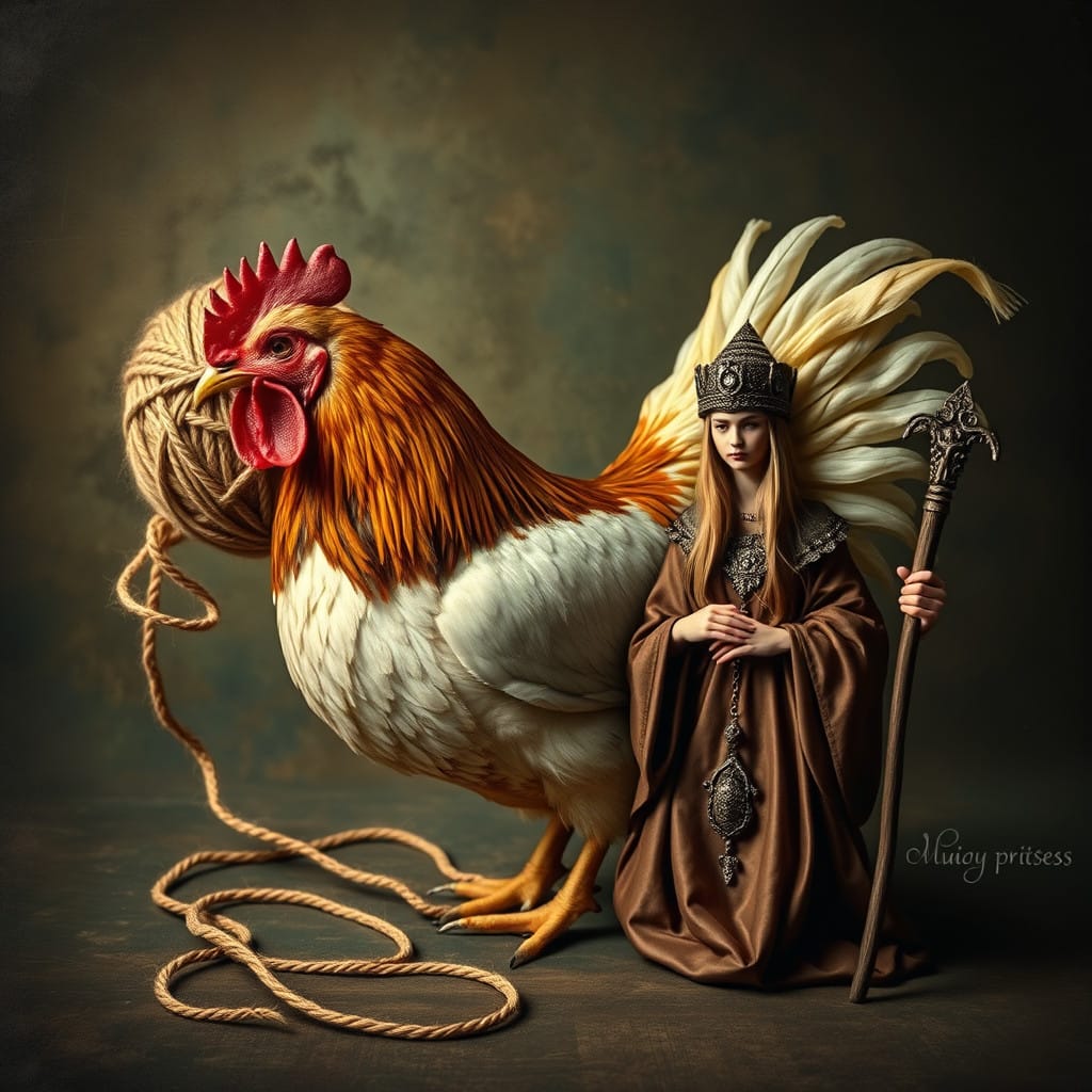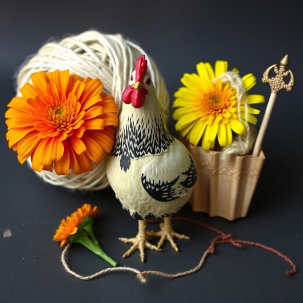 Prompt: A ball of twine, a chicken, [a marigold,] and a druid priestess.